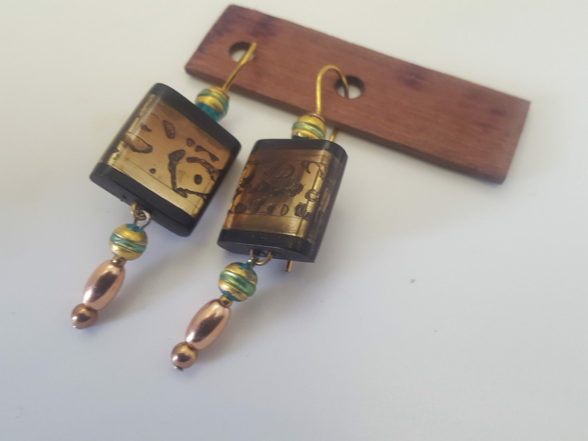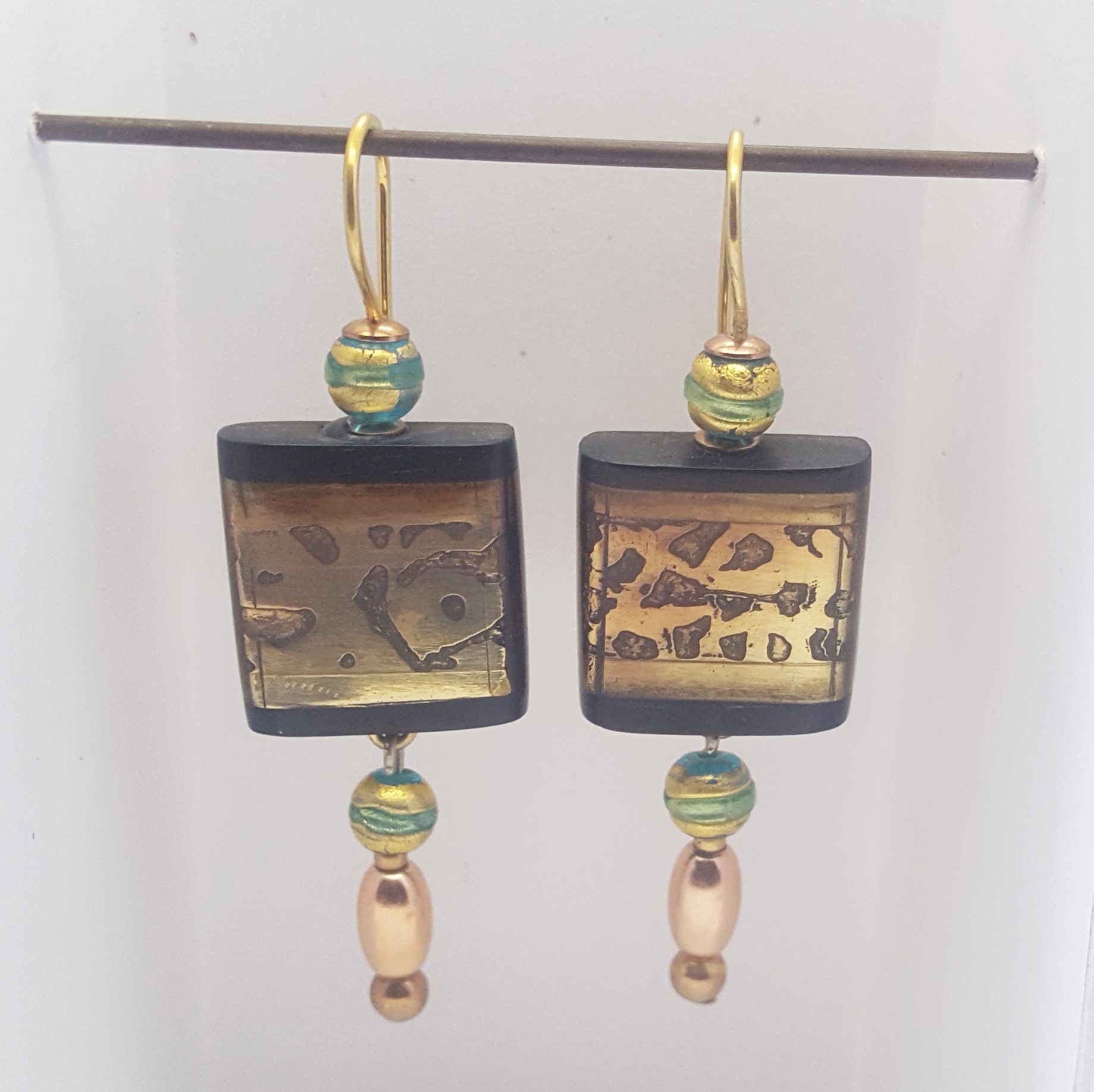 Boucle d’oreilles , carrés de bronze , perles de Murano , vermeil .