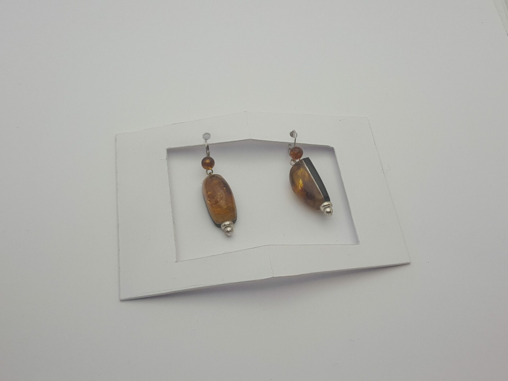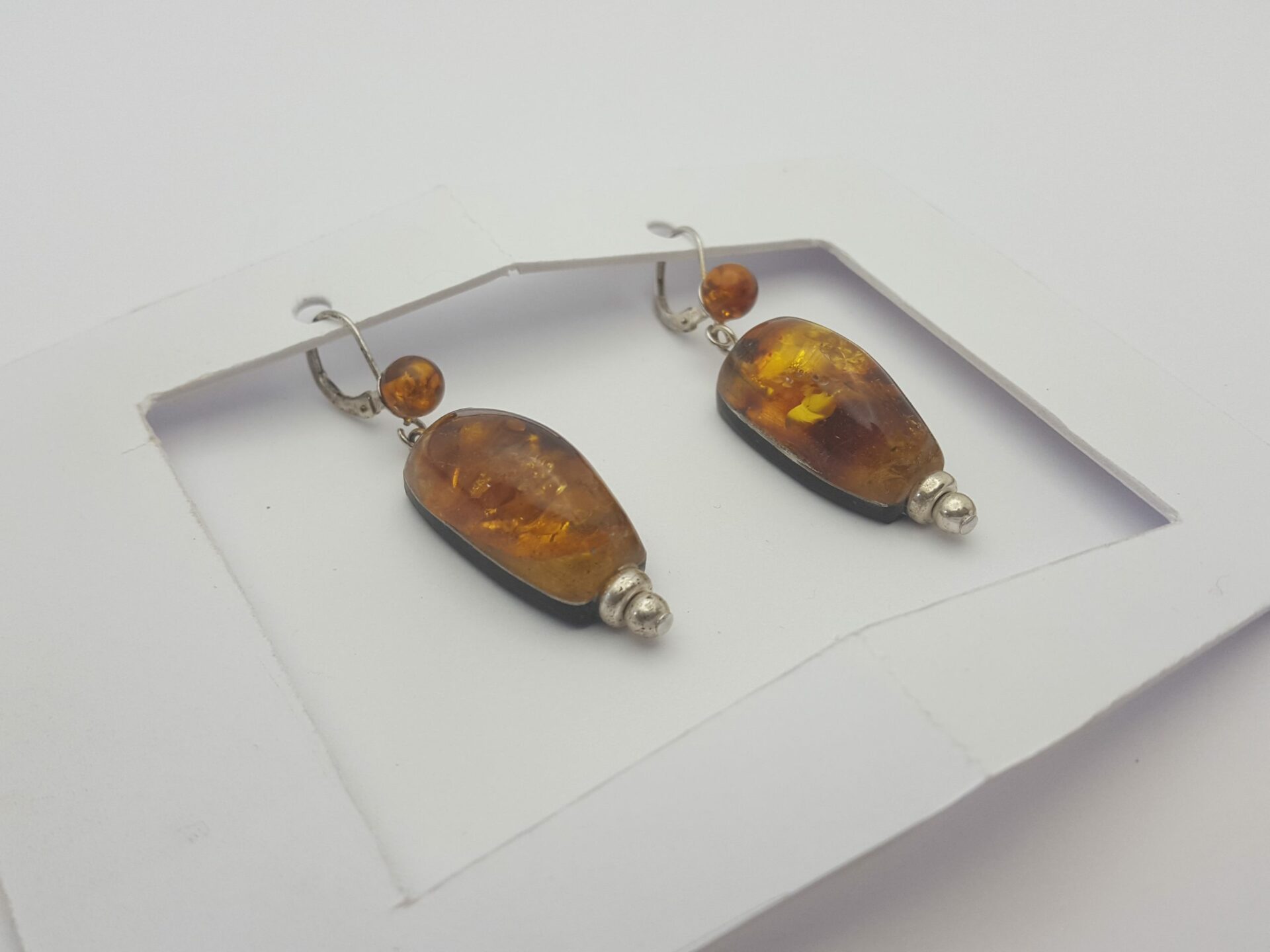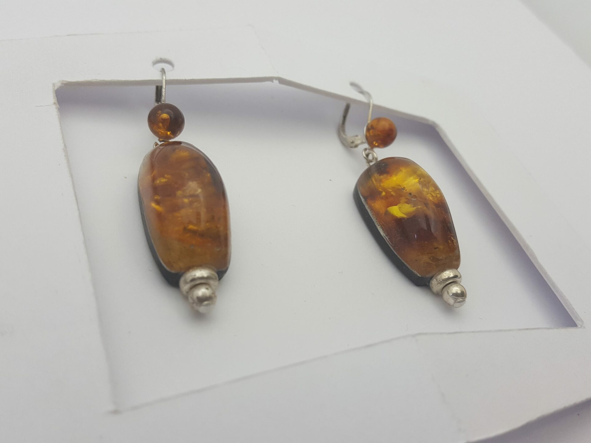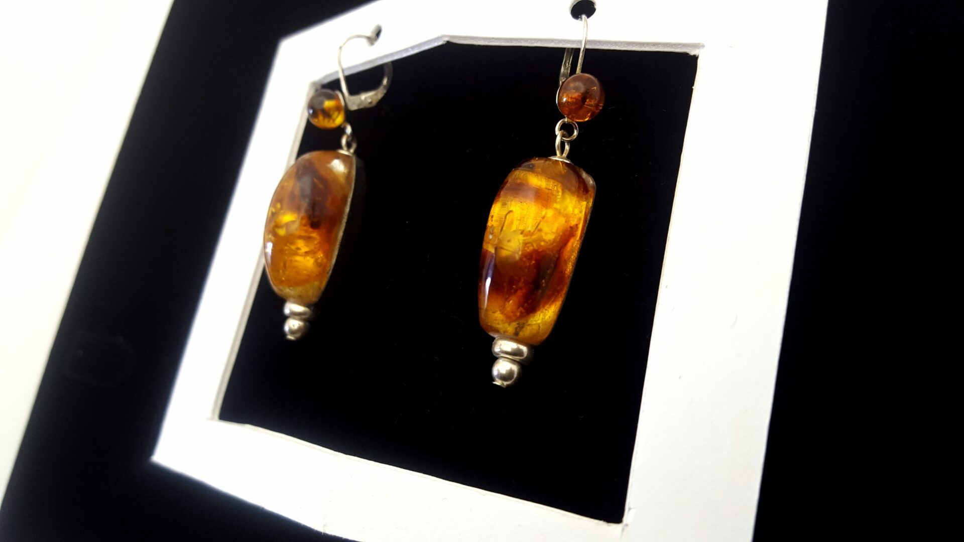 Boucle d’oreille ambre sont des boucles d’oreille jumelles asymétriques en ambre de la baltique ( perles 6 mm ). Finition et attaches en argent . Boucle d’oreille ambre , le dos de la boucle est en ébène du Gabon .Il lui confère une certaine solidité L’ Ambre de la Baltique aussi appelée l’or du Nord est une résine « récolté » sur le littoral de cette mer Baltique . Elle est bordée par les pays Baltes , la Pologne , la Suède …. L’ambre est la résine secrétée par les arbres à fleurs et les sapins des forets de l’éocène ( 44 millions d’années) . Elle s’est polymérisée ( durci )au contact de la mer pour former des blocs de taille moyenne . Il est possible de découvrir des insectes emprisonnés dans ces blocs . En effet lors de la sécrétion parfois violente de la résine coulant le long des troncs elle emprisonne tout sur son passage ( insectes lignites etc.. ) comme une mini coulée de lave .