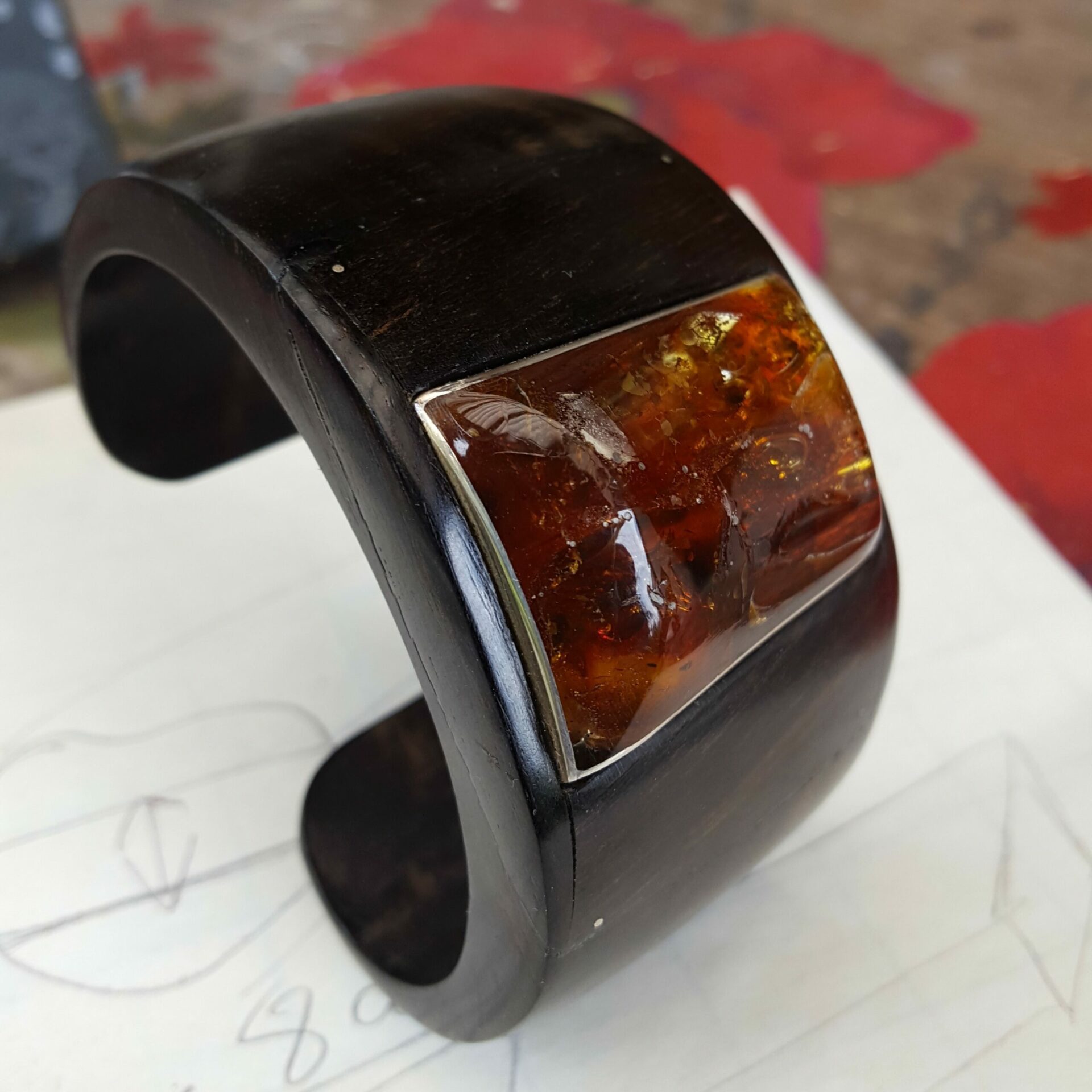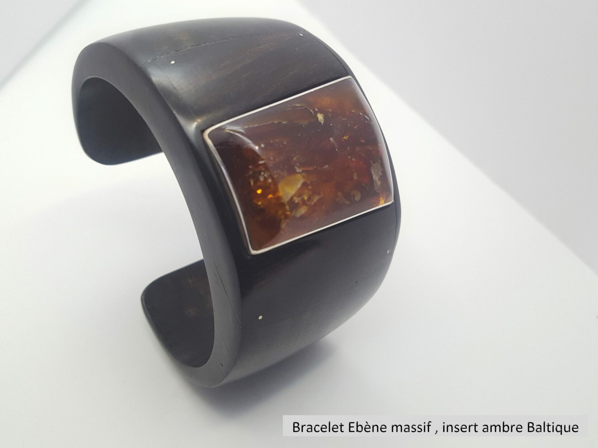 Bracelet ambre ebene est composé d’un corps de bracelet sculpté dans lébène massif . Bracelet ambre ébène c’est aussi un carré d’ambre serti d’argent . Il est encastré dans le corps du bracelet .