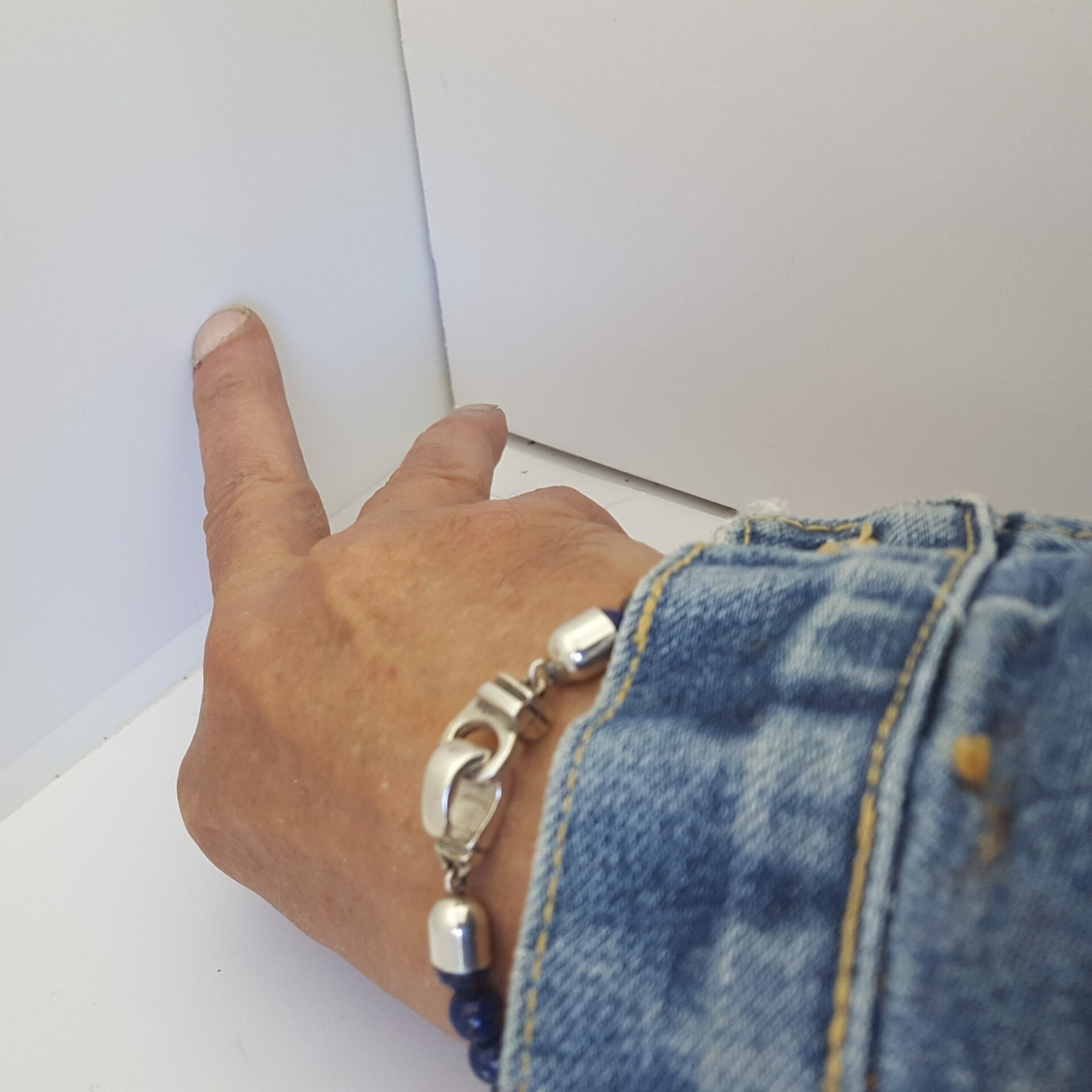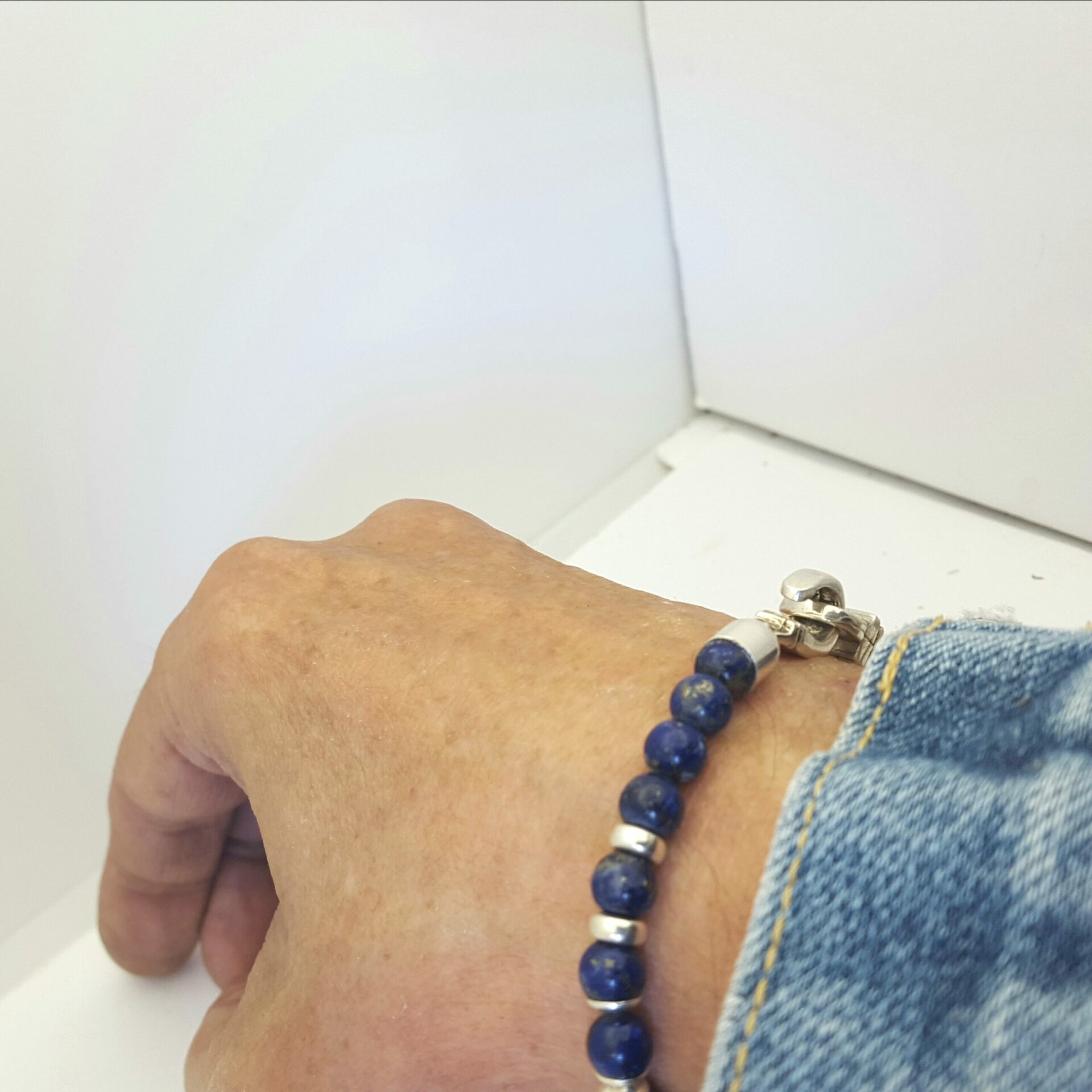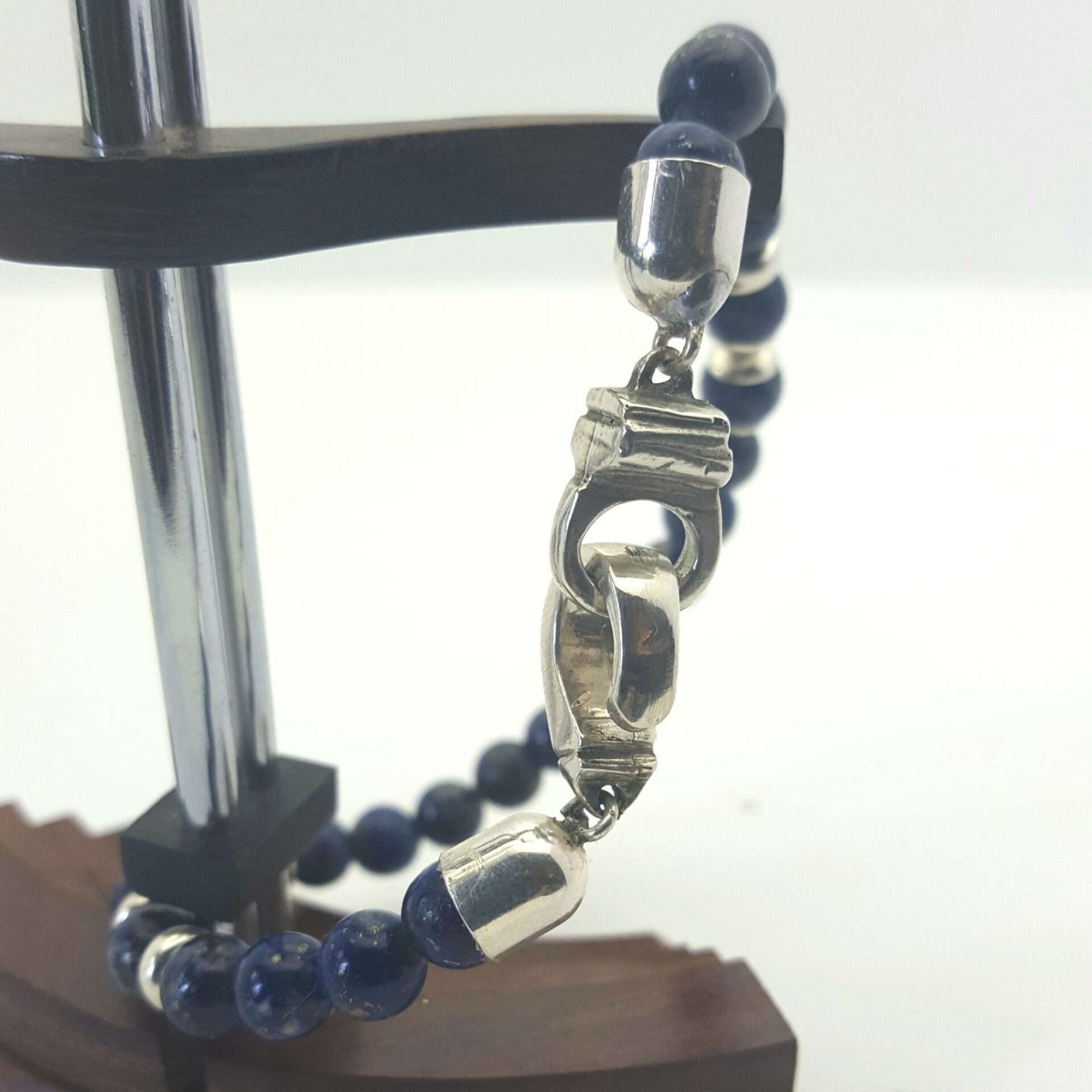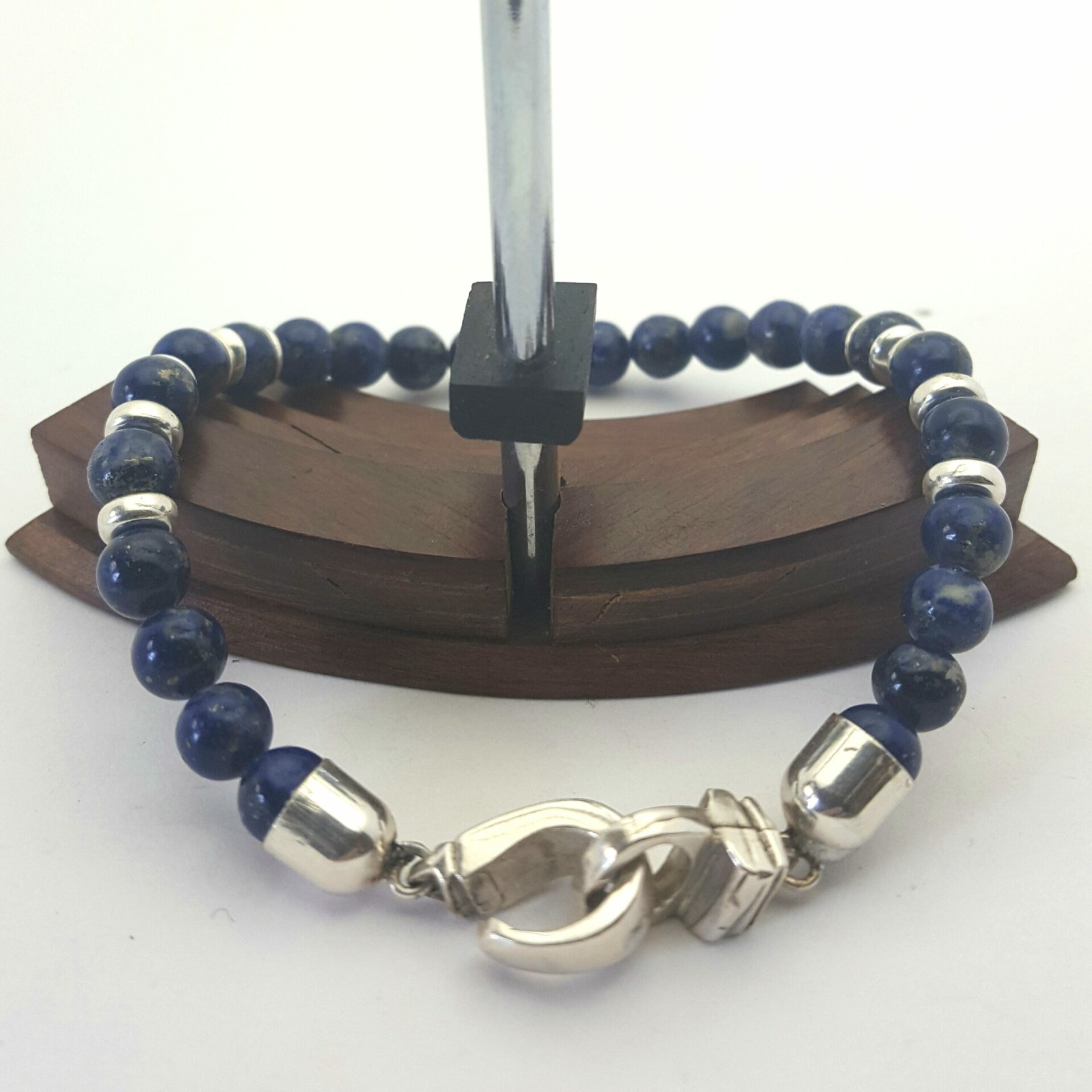 Bracelet perles Lapiz lazui ( provenance Afghanistan , exellente qualité ) . Pour ce Bracelet perles lapiz lazuli c’est une création original merlinb pour ce fermoir en argent massif . . Cire perdu puis création d’un moule pour les tirages .