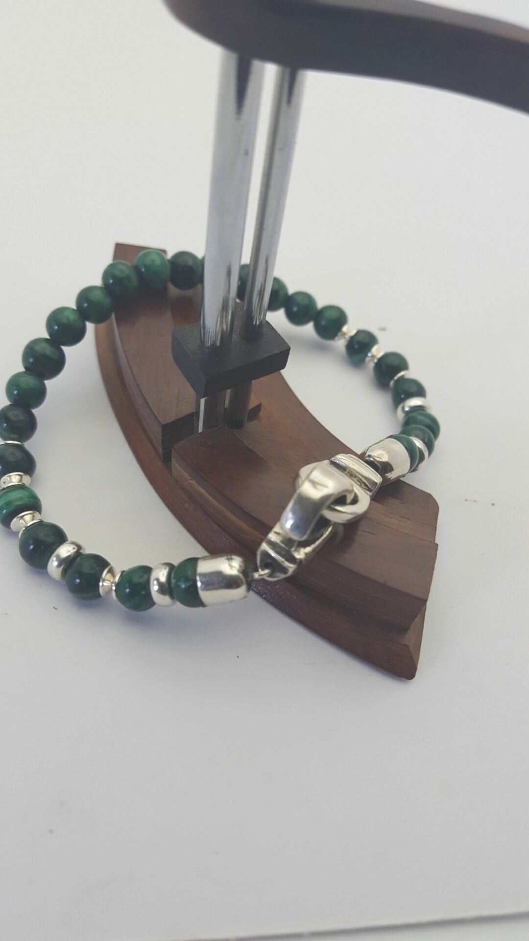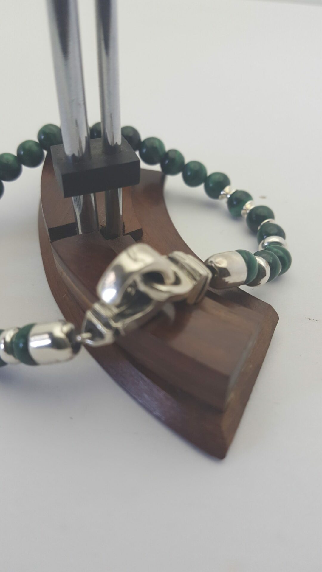Bracelet malachite est ce bracelet Zalac . Perle 6 mm en Malachite ( provenance Zaire ) et des intercalaires argent . Création original merlinb donc pour ce fermoir en argent massif . Cire perdu puis création d’un moule pour les tirages . Ce bracelet en malachite se porte de deux façons . L’une sera plus ajustée sur lepoignet . Mais ce bracelet en malachite se portera de façon plus fluide .