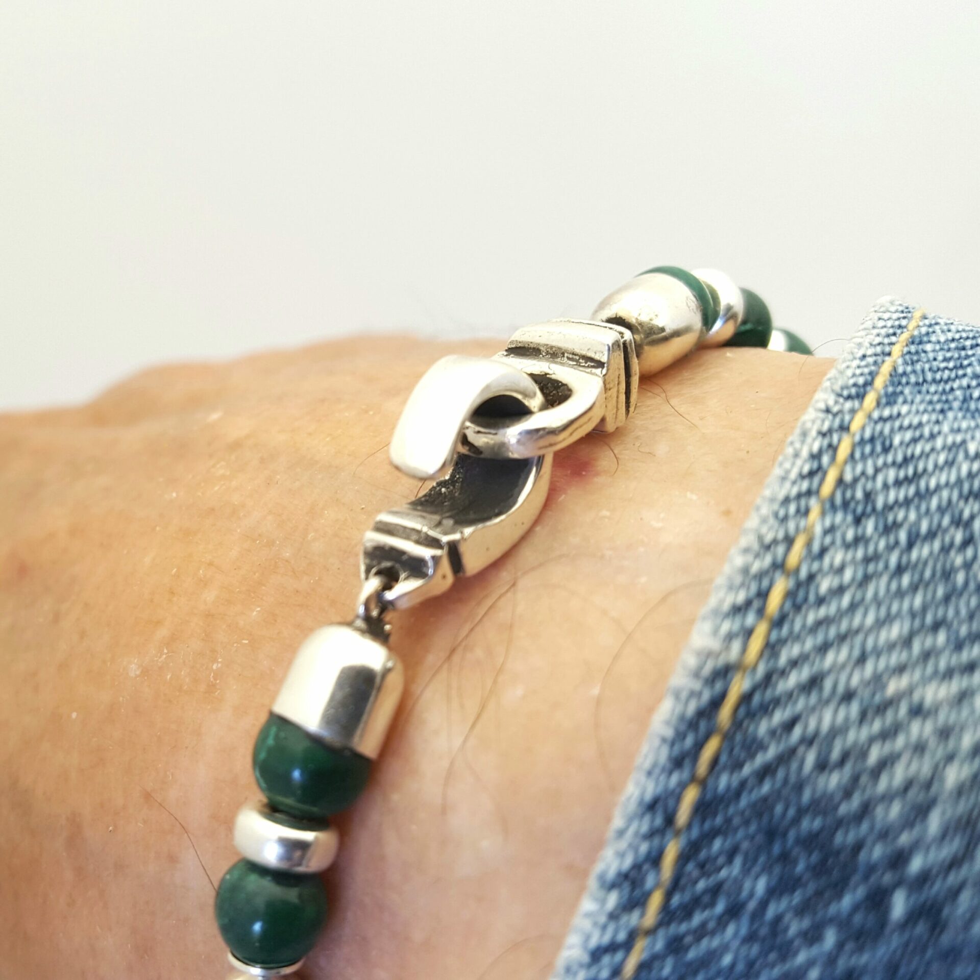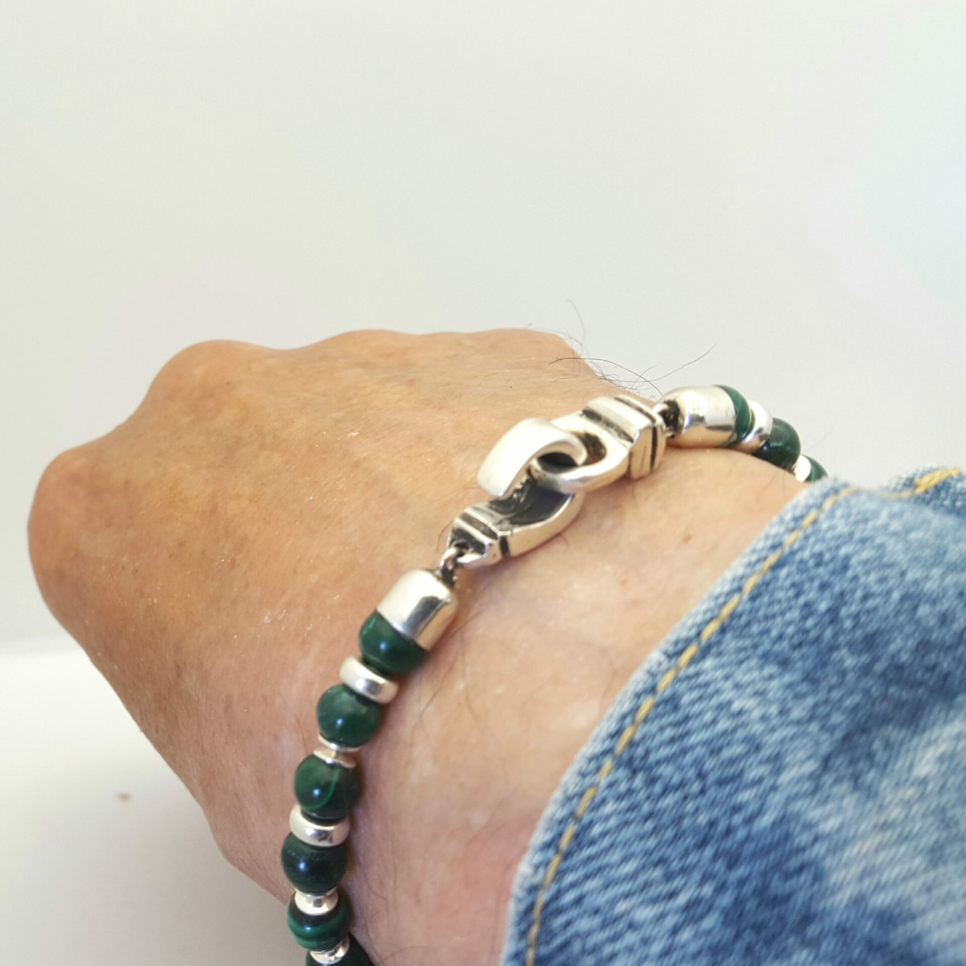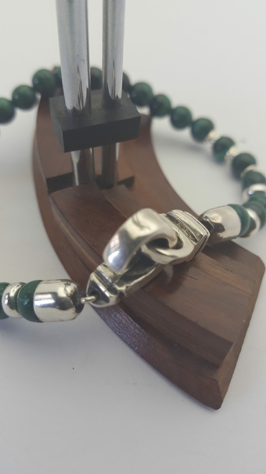 Bracelet perles Malachite , fermoir « voilier » argent massif .