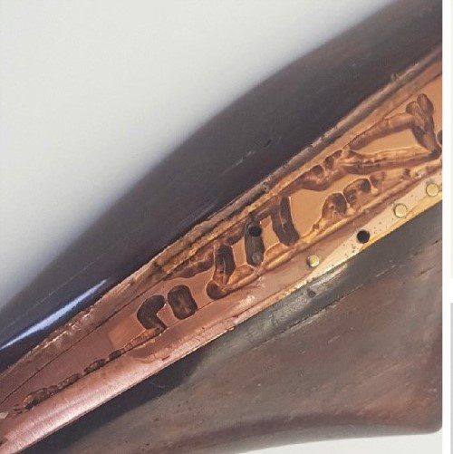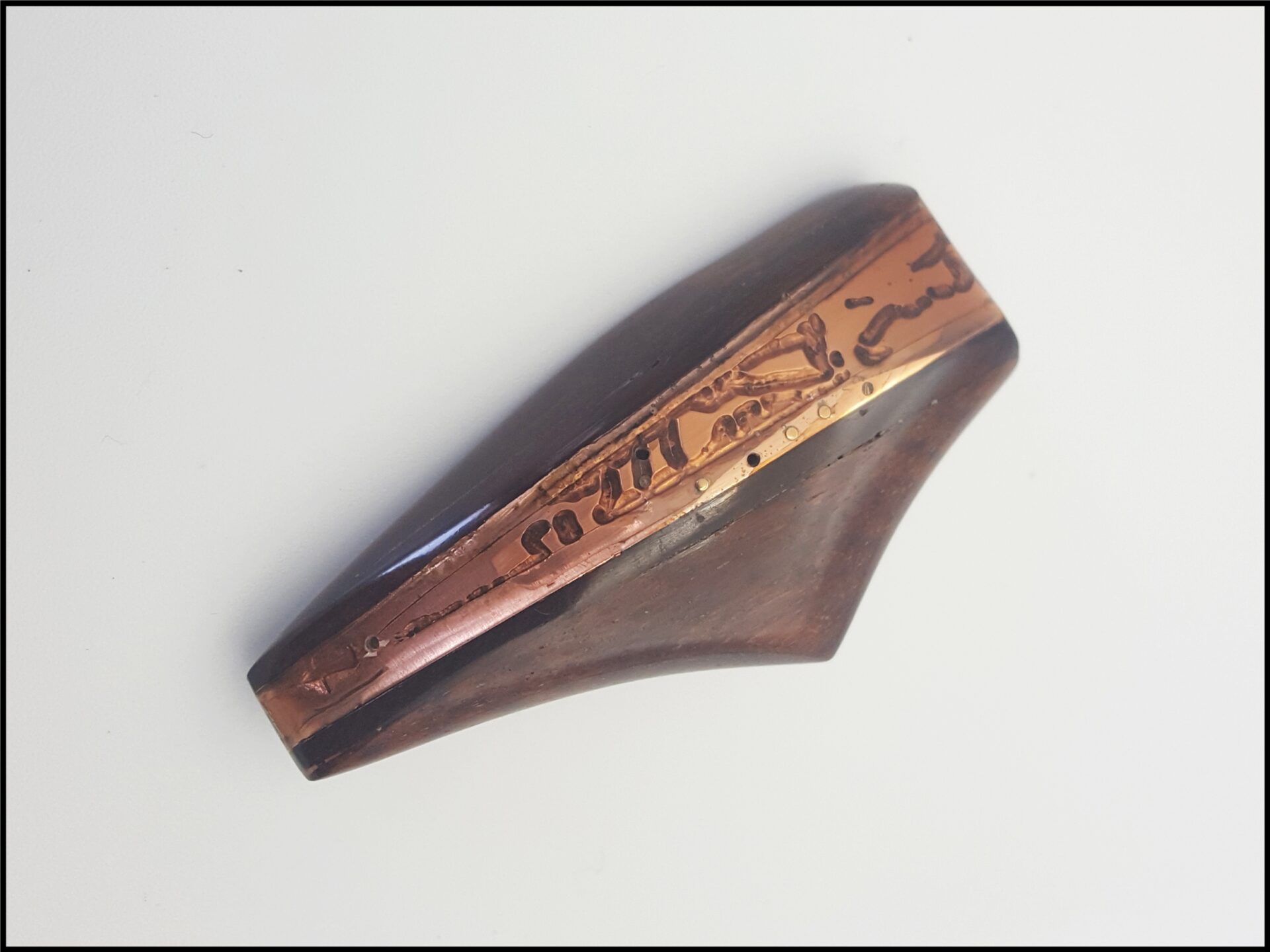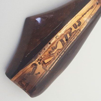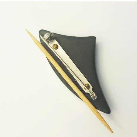 La plaque légèrement galbée est enchassée dans deux formes en bois d’amourette de Guyane . Le dos de la broche amourette ( bois précieux ) est en ébène du Gabon ( Afrique de ‘Ouest ) . Un système de fermeture sécurisé en maillechort est riveté dans le bois avec deux petits rivets en bronze