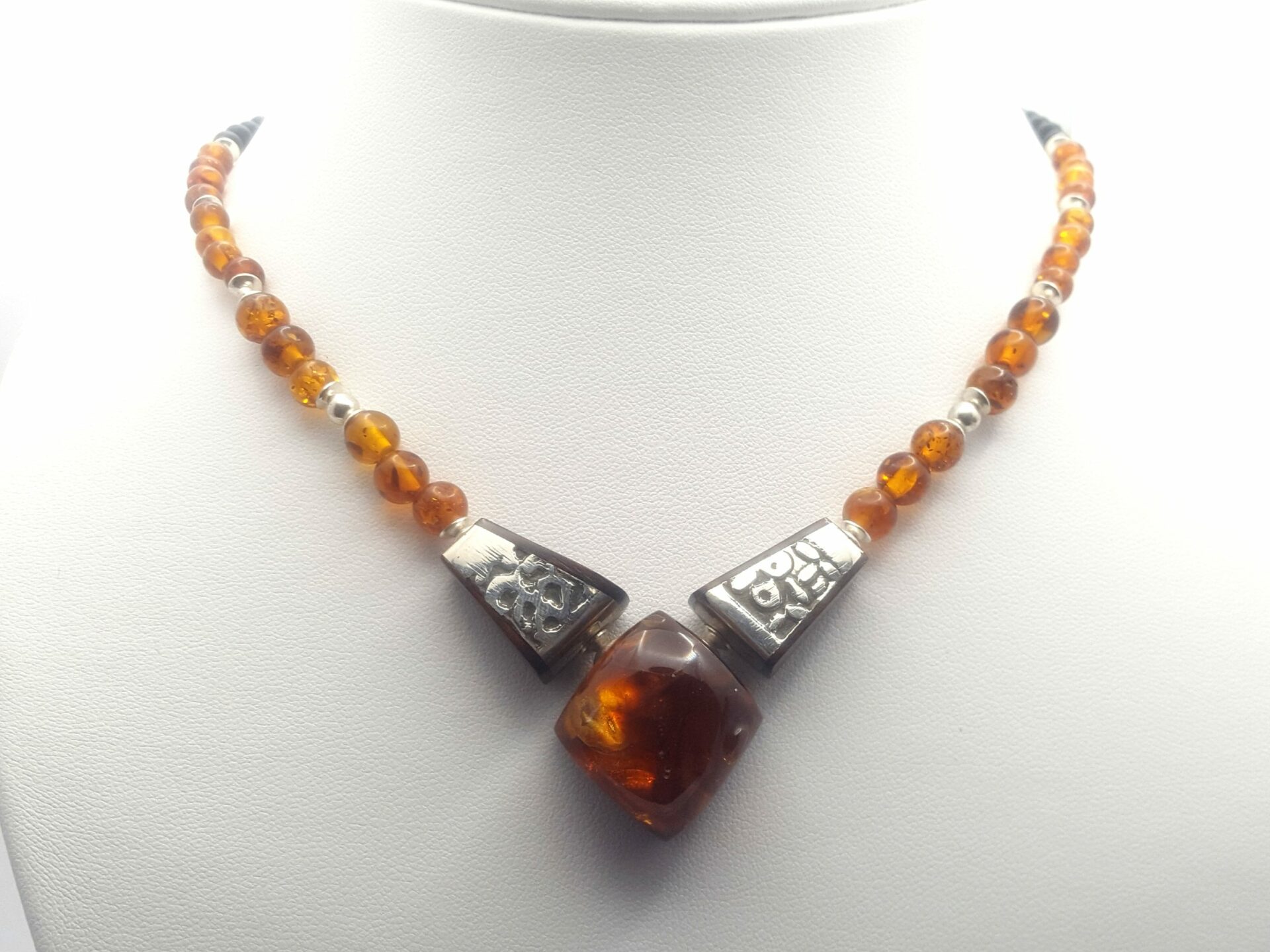 Collier trois éléments bloc d’ambre et argent patiné et gravé ( eau-forte ) perles ambre .