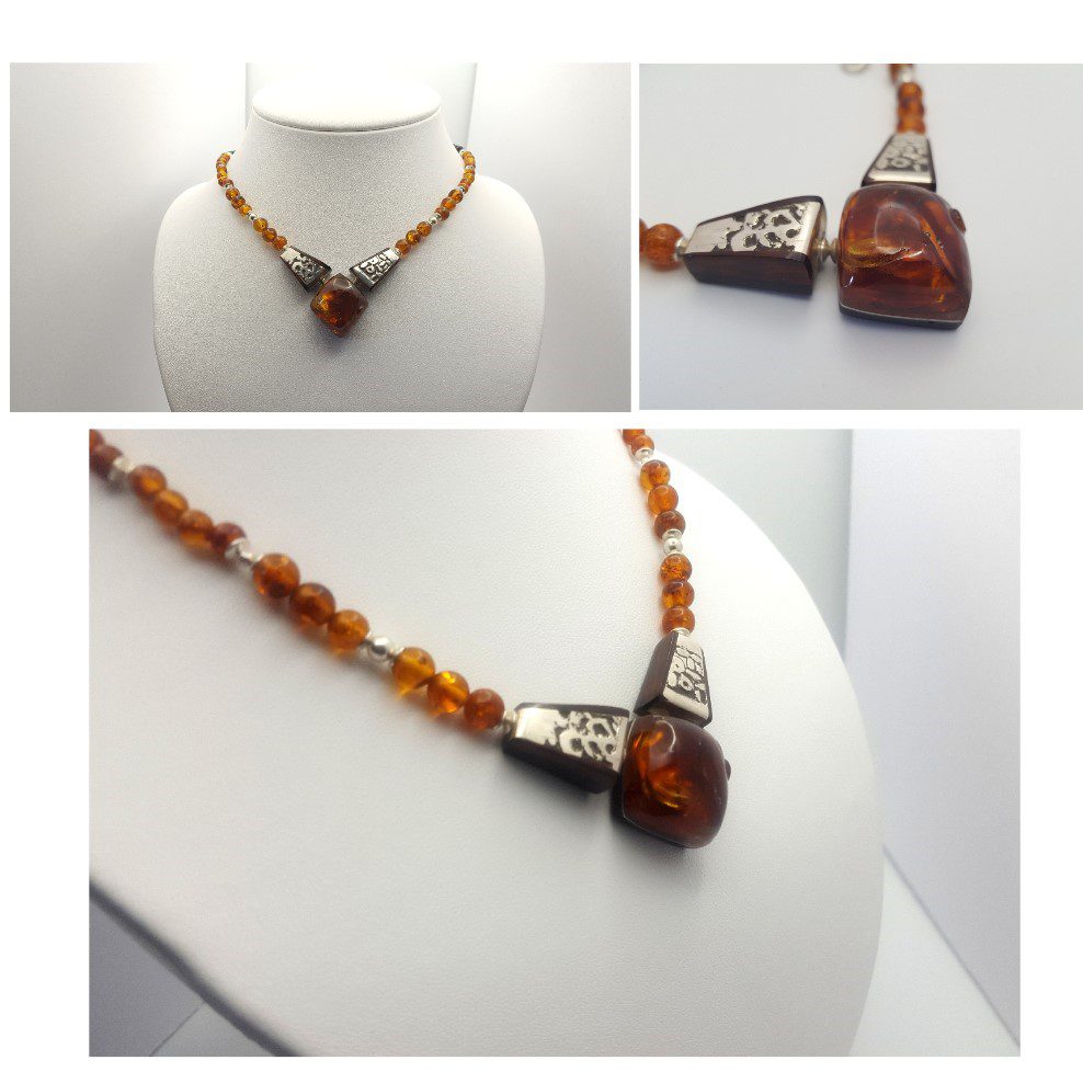 collier ambre est un collier de trois éléments . Elément central bloc d’ambre sur fond d’ébène . Deux éléments latéraux argent gravé et patiné ( eau-forte ) . Chaine perles d’ambre 6 mm , onyx dépoli . Perles et fermoir « mousqueton  » argent sont les finitions de collier ambre .