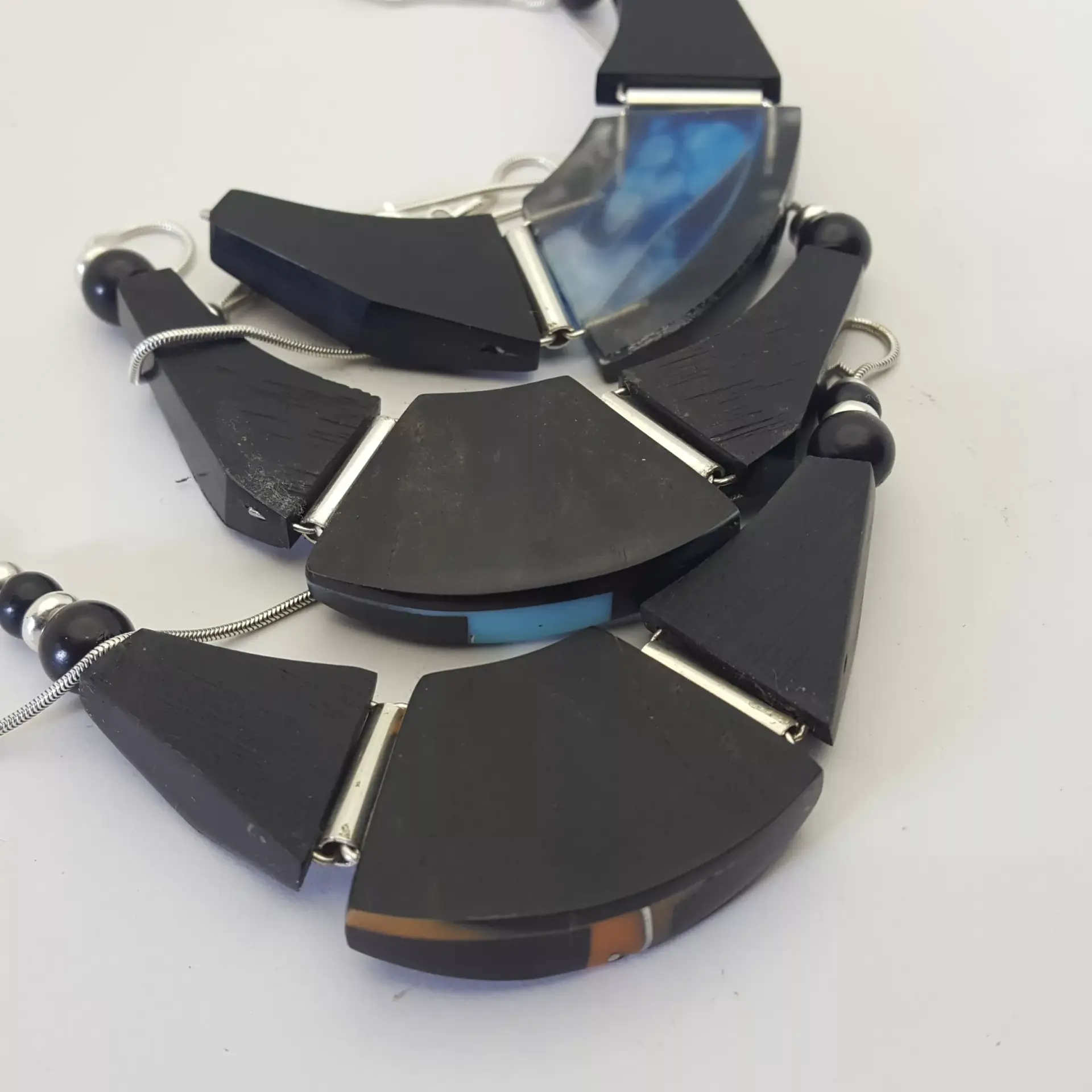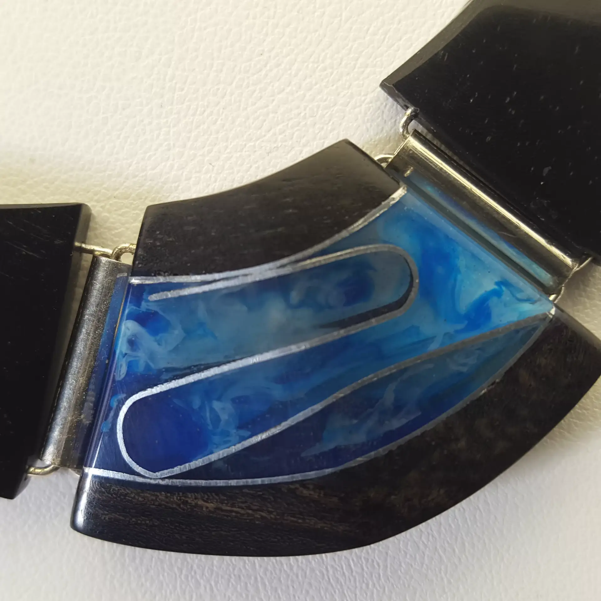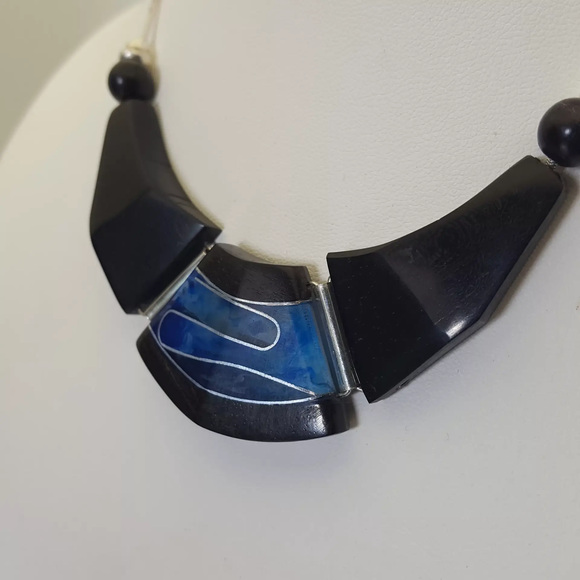 collier bélem nuage est un monobloc d ébène et de résine bleu nuage : Ce collier se distingue par ses formes biseautés désing simples . Elles sont découpées avec précision dans ce monobloc. Le bois d’ébène est la base de la pièce . Taillé et découpé précisément C’est aussi une base naturelle et solide.