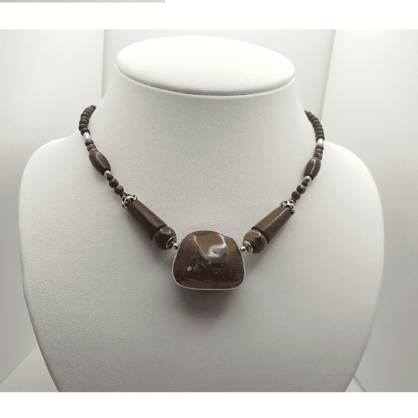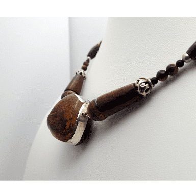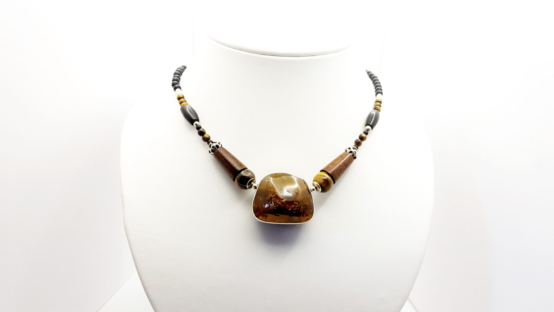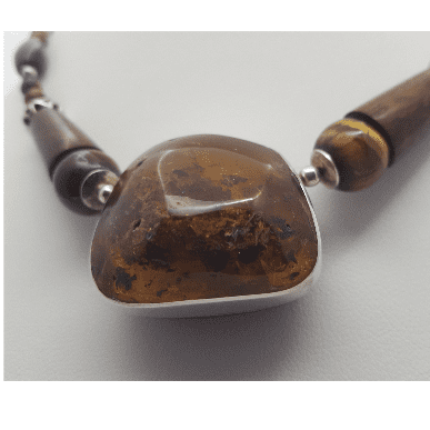 Bloc ambre argent amourette . Eléments latéraux sont des tubes de bois d’amourette .Ils sont Agrémentés de perles en œil de tigre qui s’encastrent dans le tube . Perles d’argent Afghane vintage ; chaine ; olives an corne de zébu , perles en œil de tigre . Attache mousqueton argent . Ce bloc ambre , argent et amourette pour les tubes sont parfaitement polis