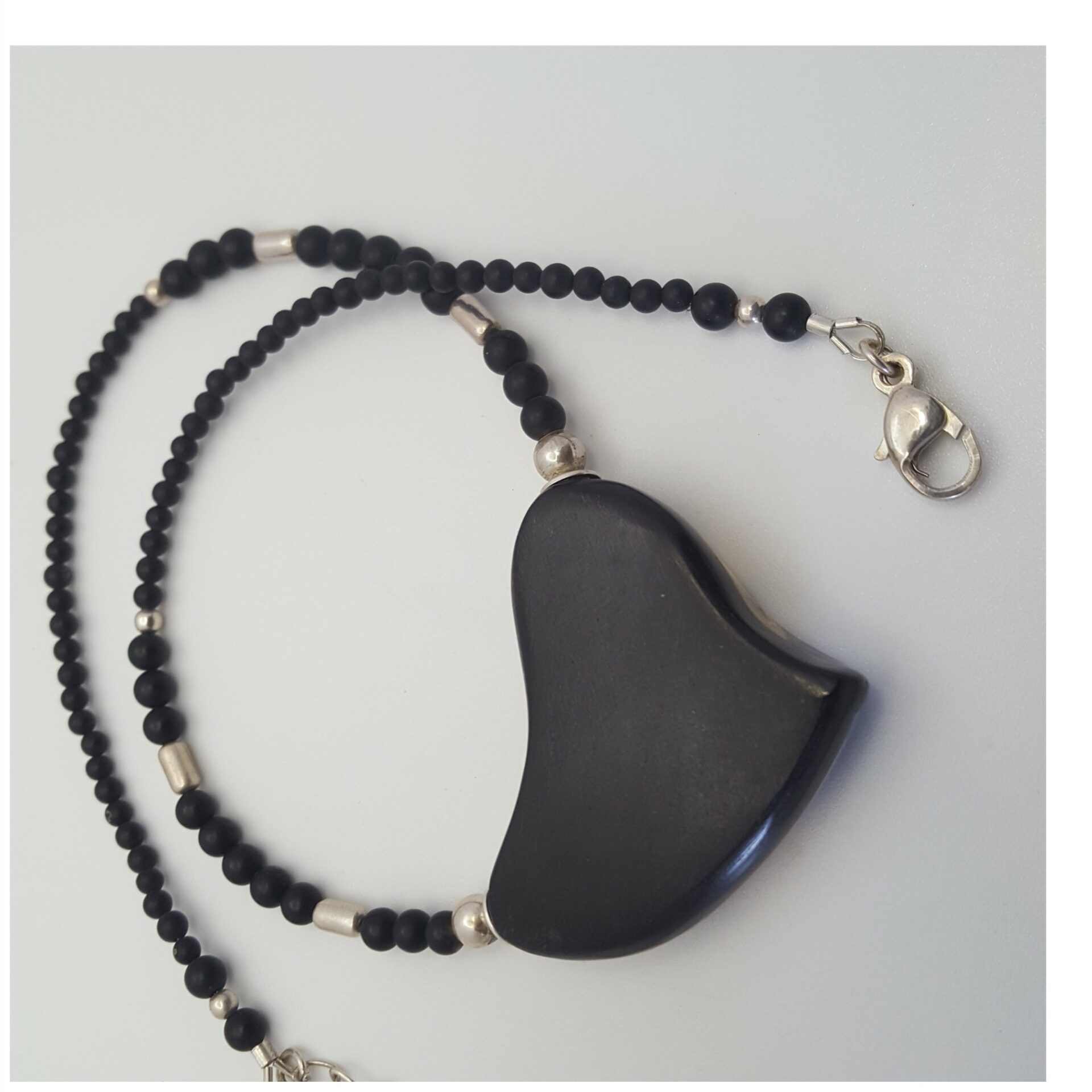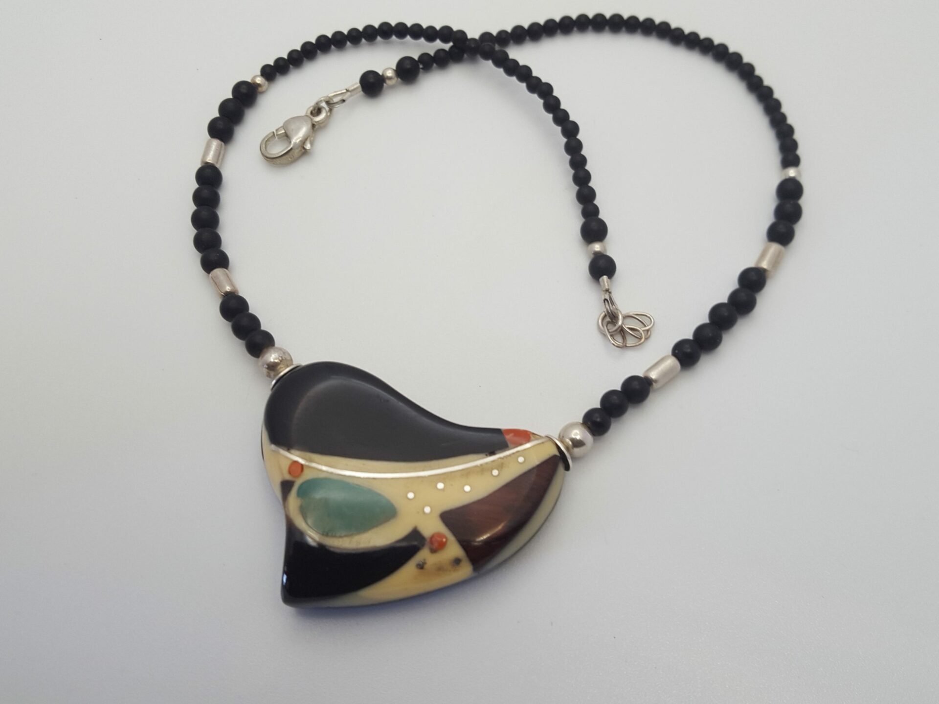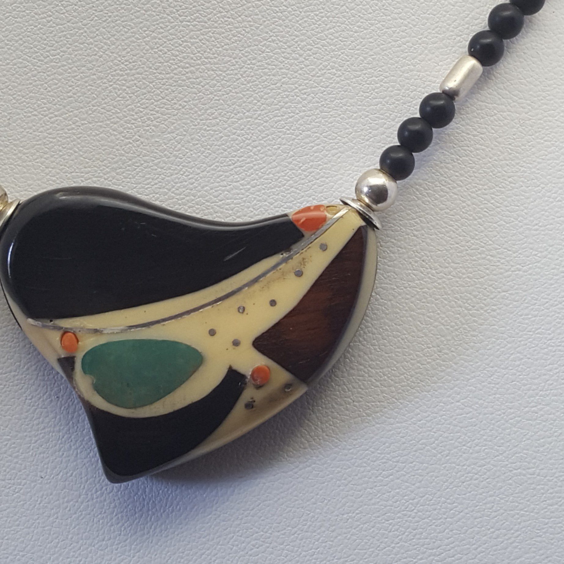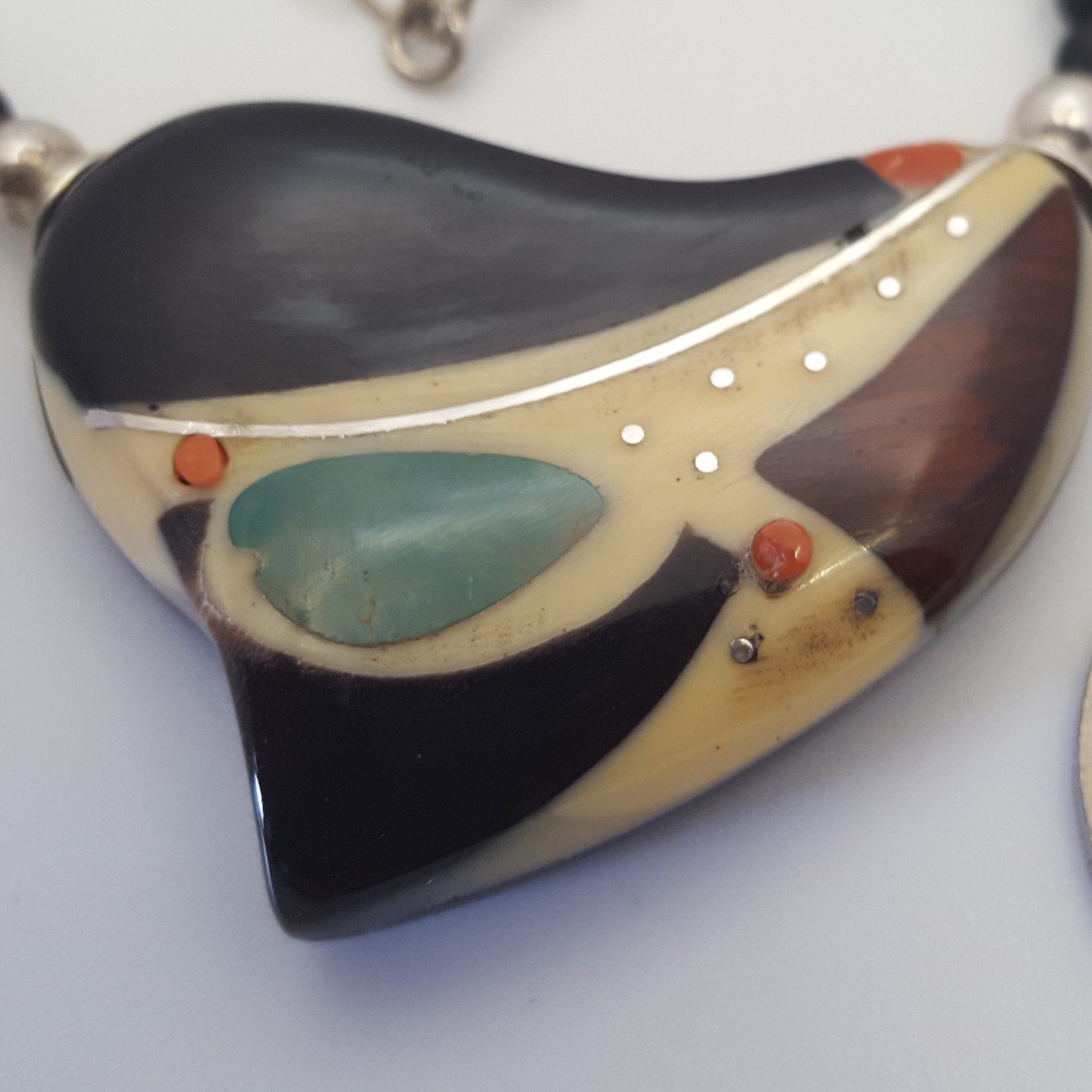 Ce collier-médaillon est en ebene et corne . C’est un mono-bloc composite – Corne zébu ou ébène – Bois d’Amourette . Avec son dos galbé en ébène , il est bi-face . L époxy est couleur « sable »- La turquoise est dans lit d’epoxy ivoire , PIqures et ligne en argent – petites colonnes de corail sont incrustées , Dos galbé est en ébène – Chaine – Perles onyx , tubes argent . Dos ébène du Gabon pour ce modèle ebene et corne . Finition mousqueton argent .
