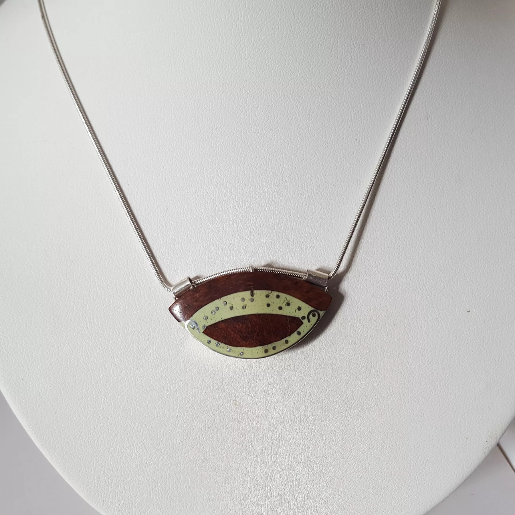 médaillon Coben pomme est un médaillon collier . Le médaillon est un mélange de bois d’amourette et d’époxy de couleur . Il est soutenu par une chaine argent coulissante qui solidarise l’ensemble .