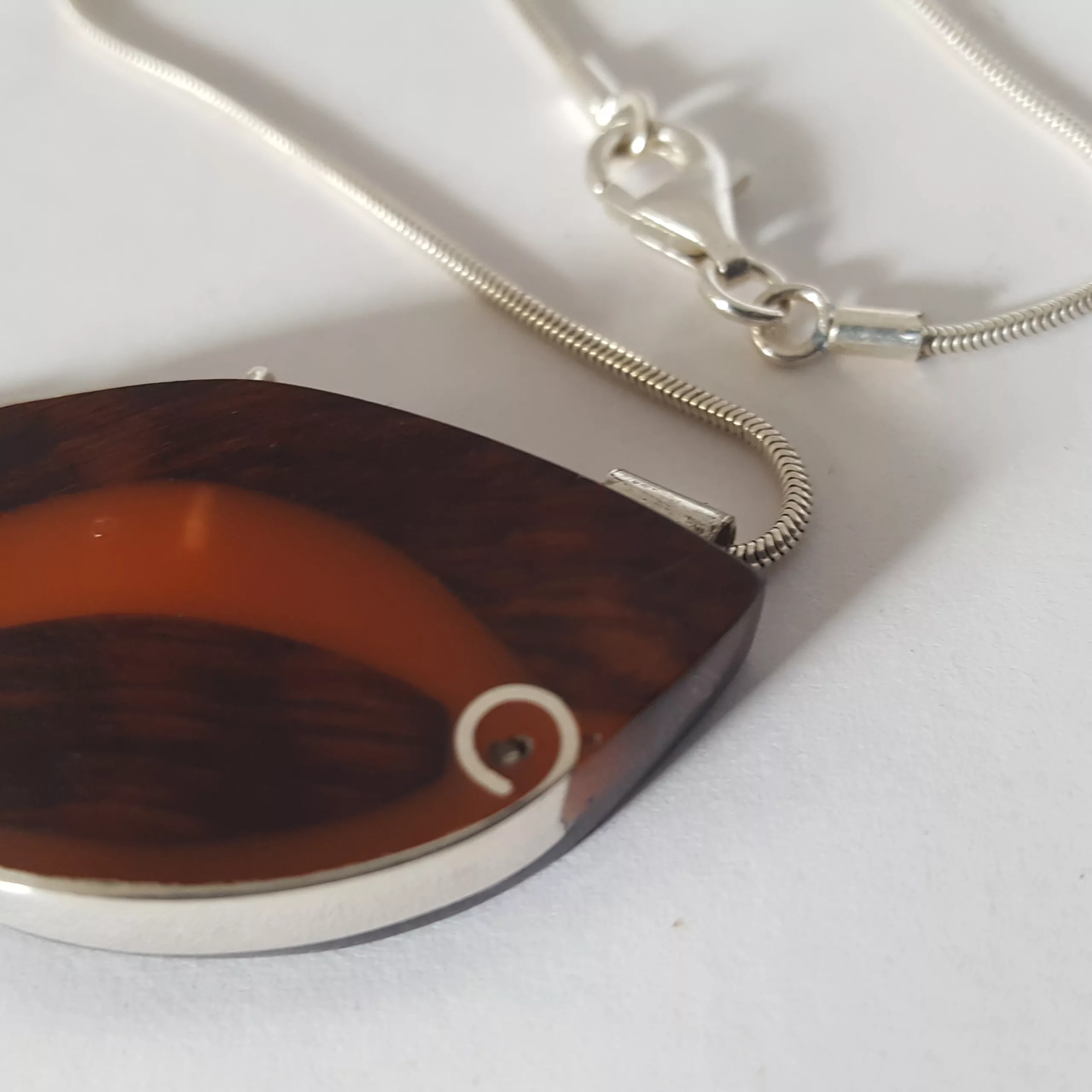 • médailon couben rouge le charme moderne : L’association du bois précieux, de l’époxy coloré de l’argent crée un collier à la fois moderne et intemporel. C’est un peu l’alliance de  la nature et l’artisanat pour un design résolu .