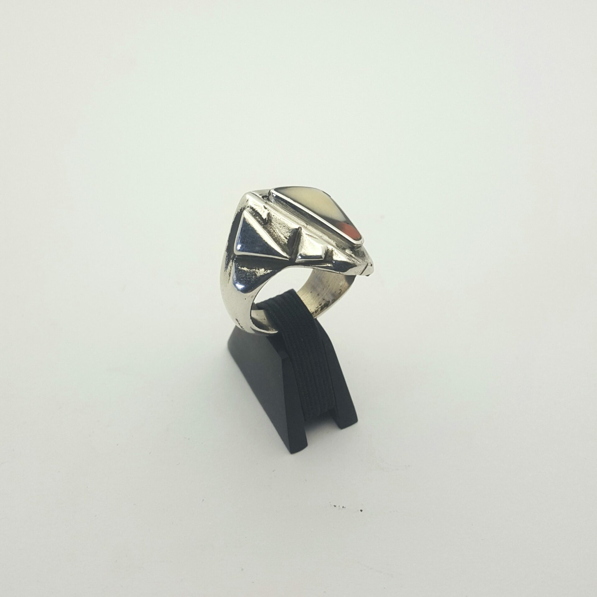 Bague argent massif ( 15 g ) Triangle  Ivoire végétal ( Corozo ) – Pointe corail rouge .
