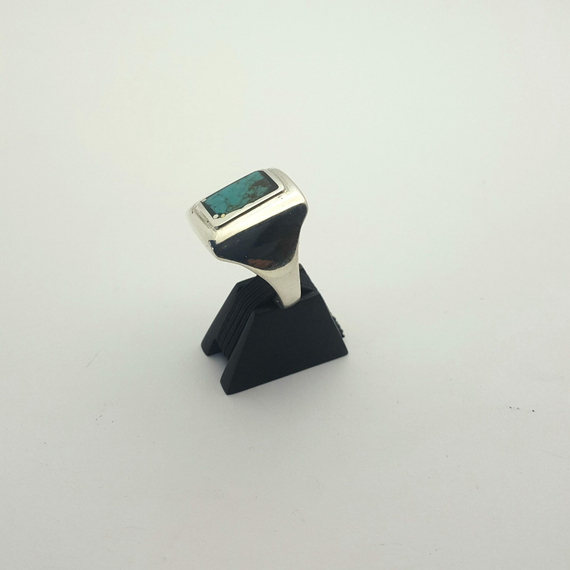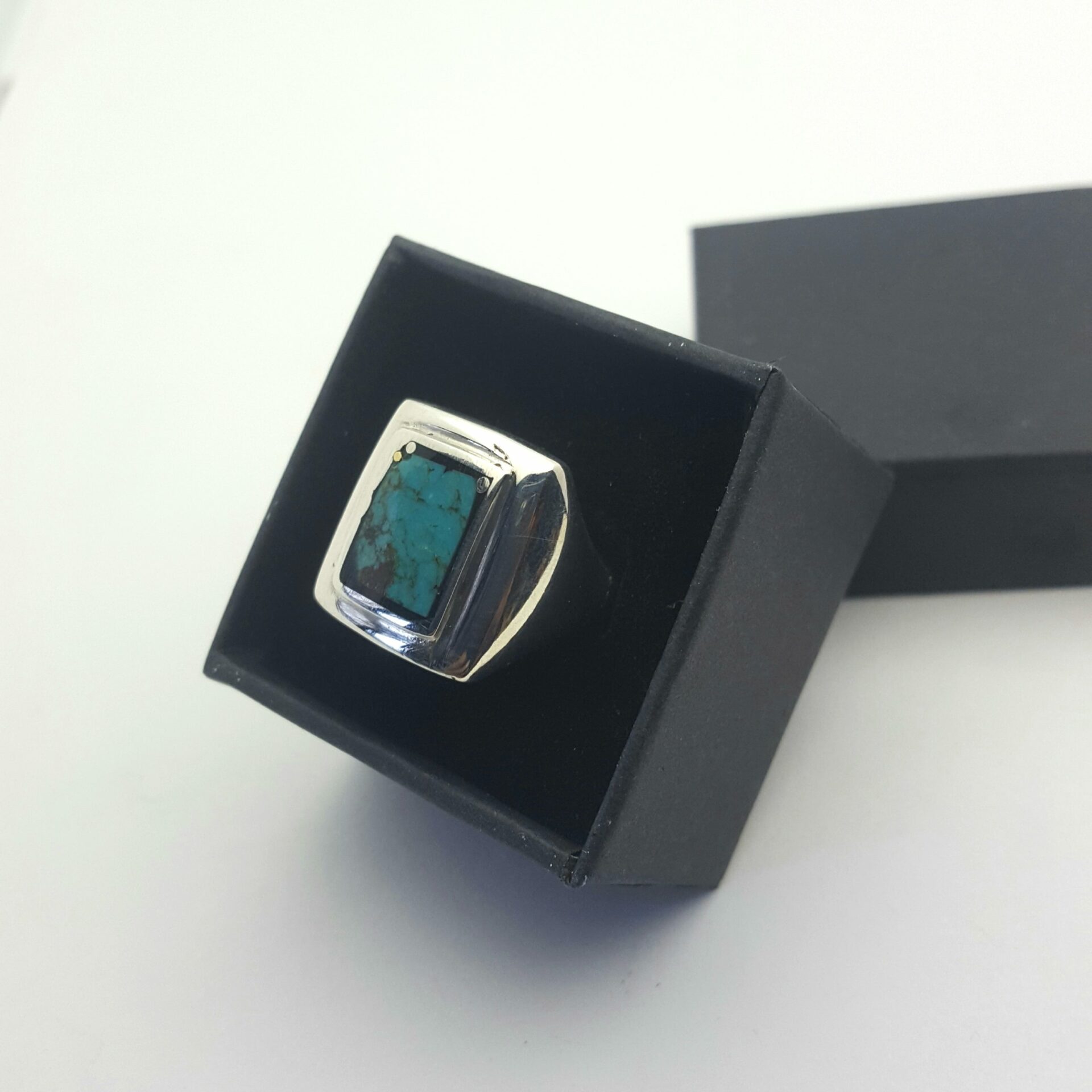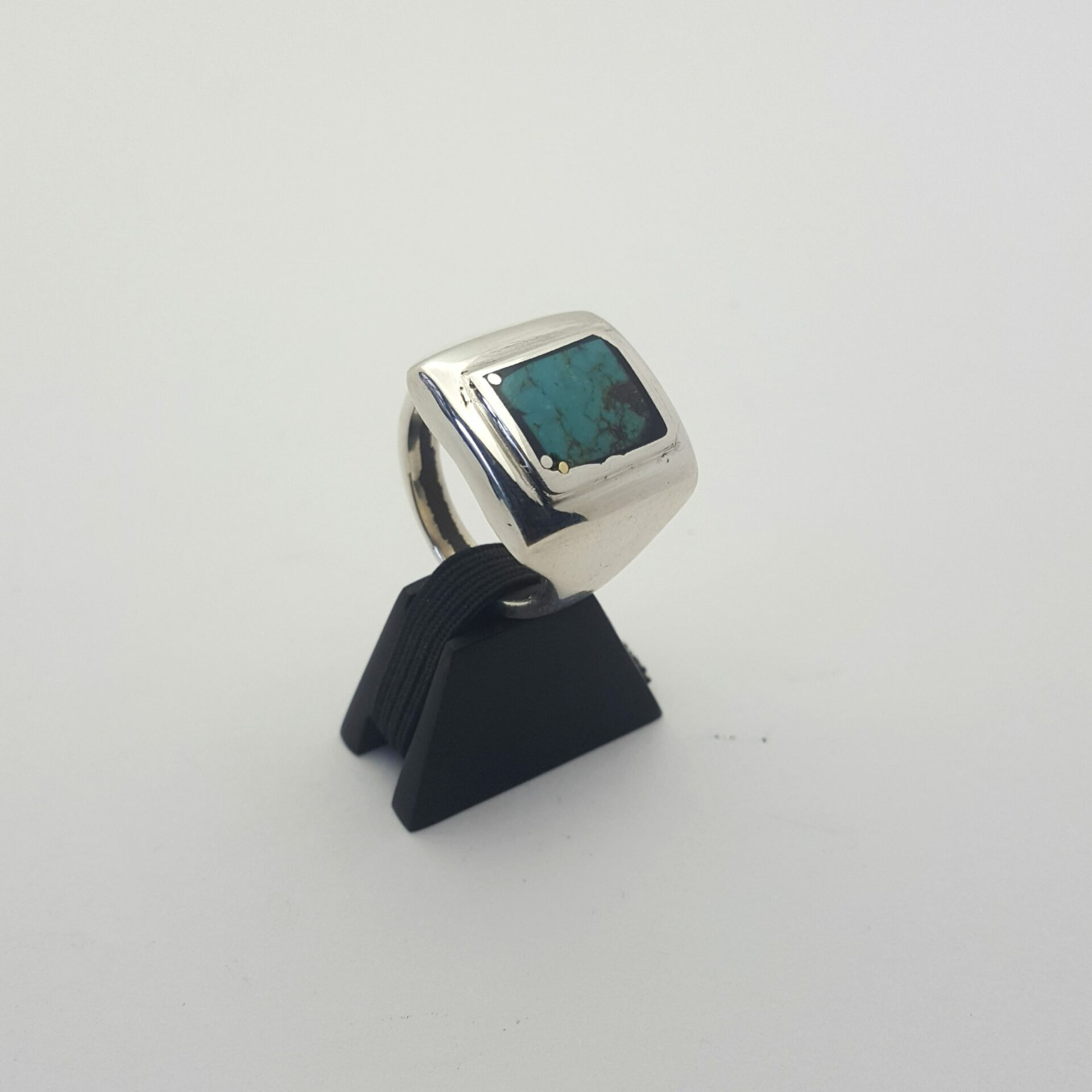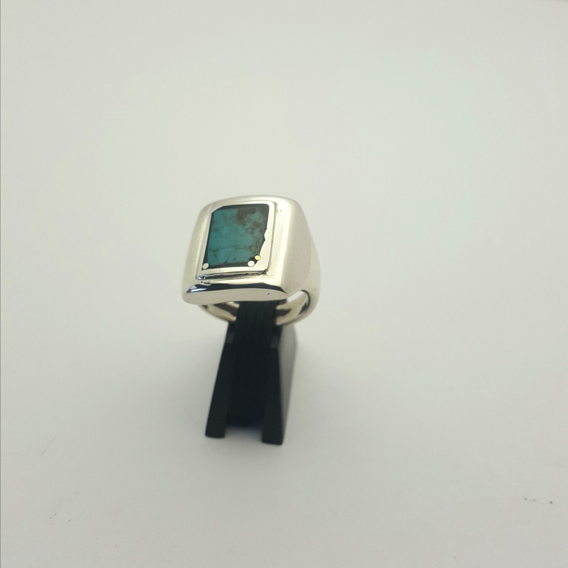 Bague turquoise dont la pierre est sertie dans la cuvette argent .  la turquoise est scellée dans une époxy noire . La petite pluie d’argent est une piqure de clous d’argent  .
