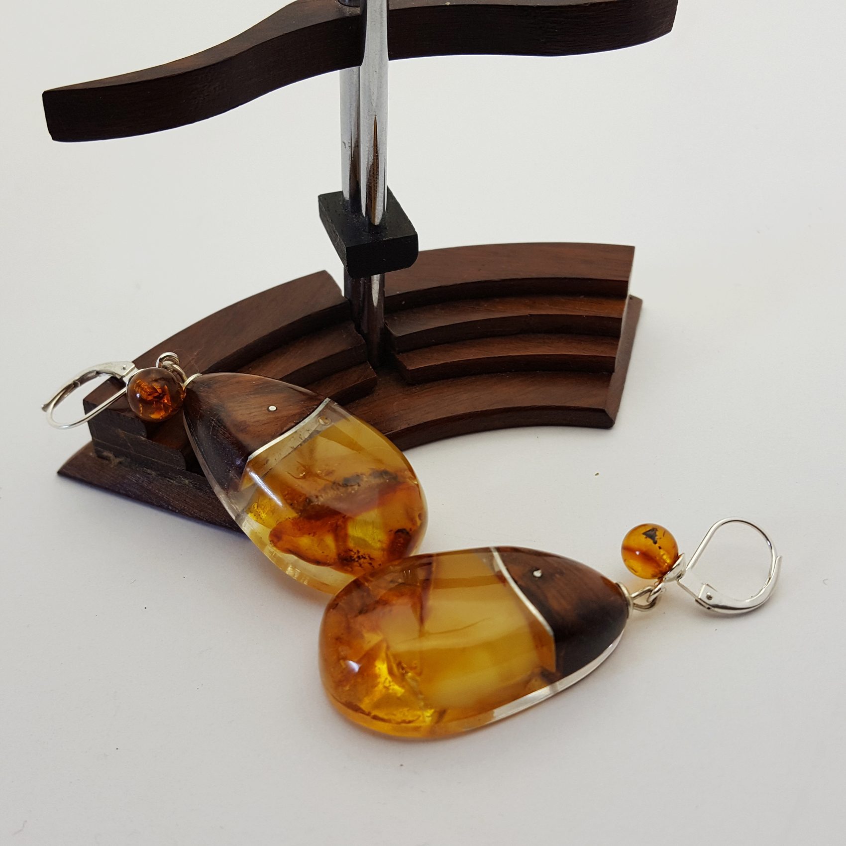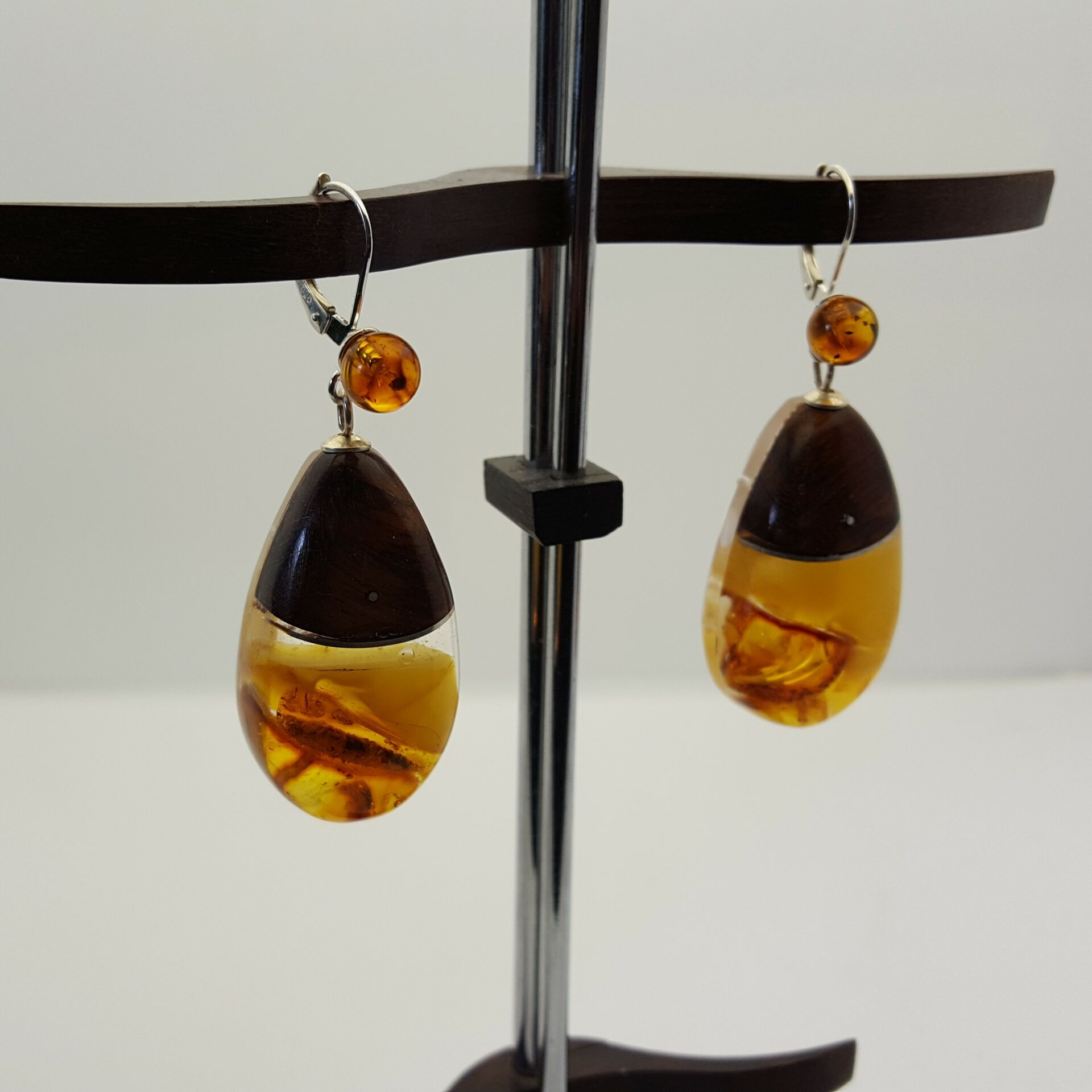 Boucles d’oreilles bicolores ambre de la baltique , amourette de guyane .