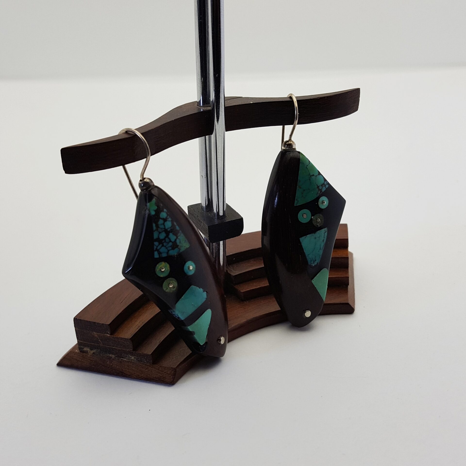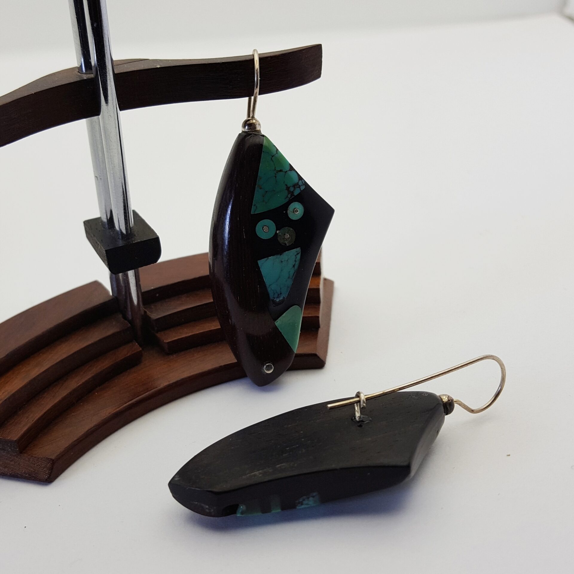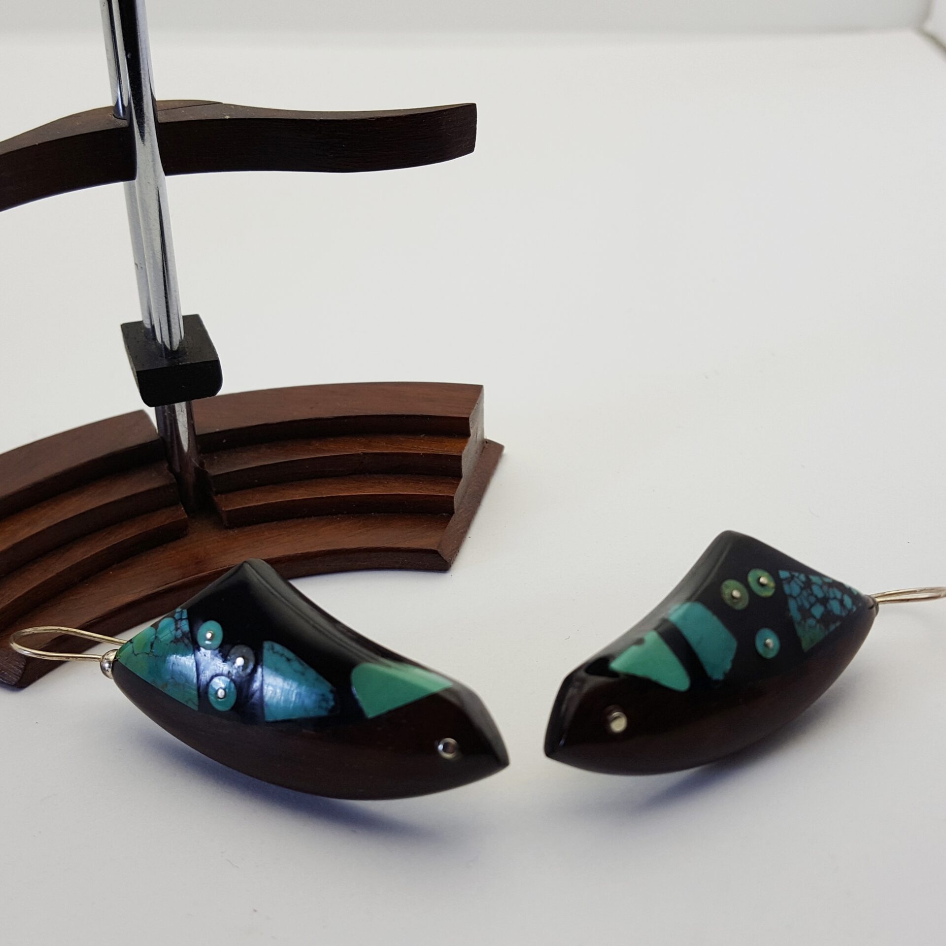 boucle cerf-volant est un monobloc composé de trois éléments : turquoise , amourette , époxy . La turquoise et l’amourette de Guyane sont scellés dans une époxy noire . Dans le dos de la boucle en ébène du Gabon est fixé un crochet de sécurité . Il maintient fermé la tige de la boucle d’oreille ( voir photo 3 ) .boucle cerf-volant est un bloc parfaitement poli mirroir . Ce n’est ni mat ni satiné . Les perles et le fil sont en argent .
