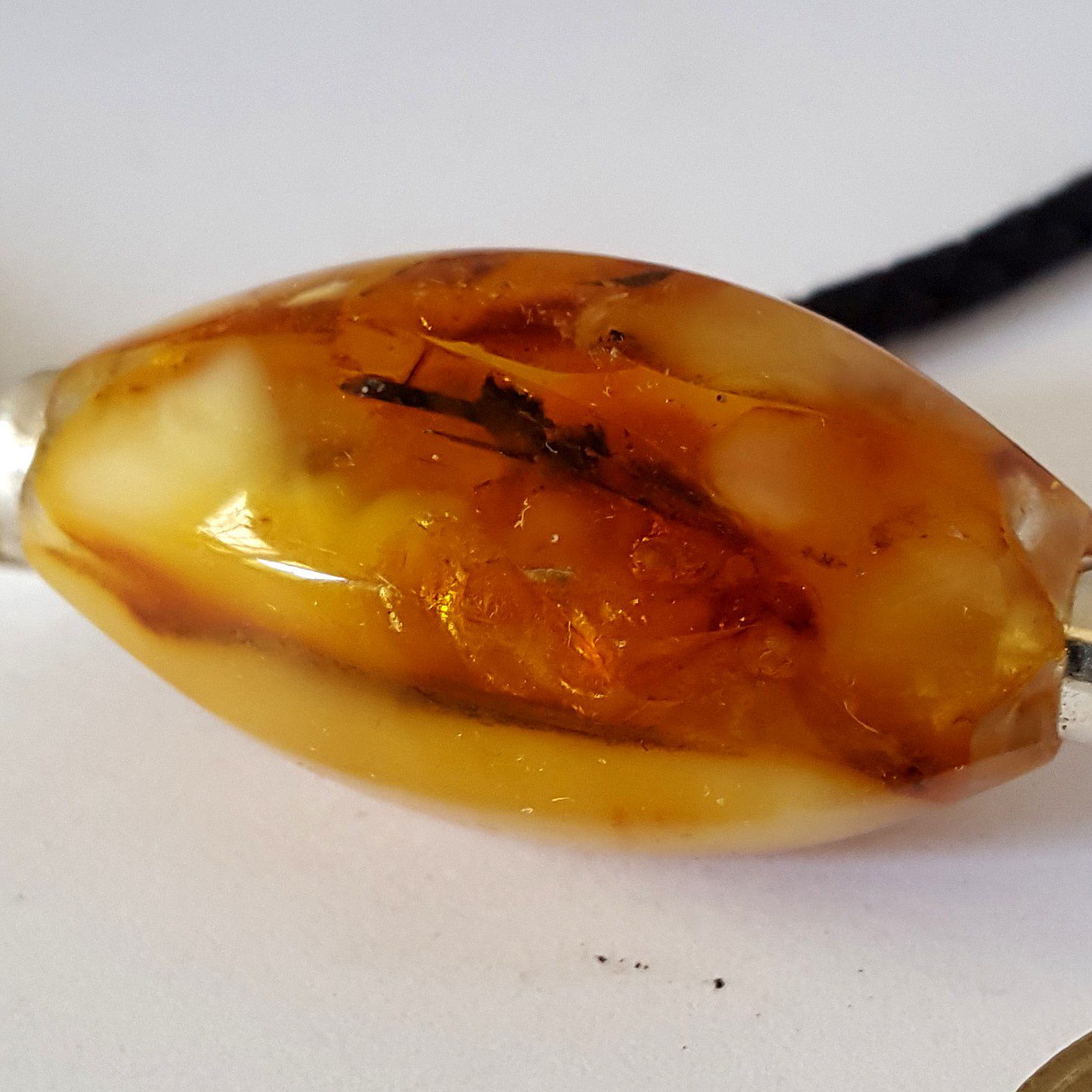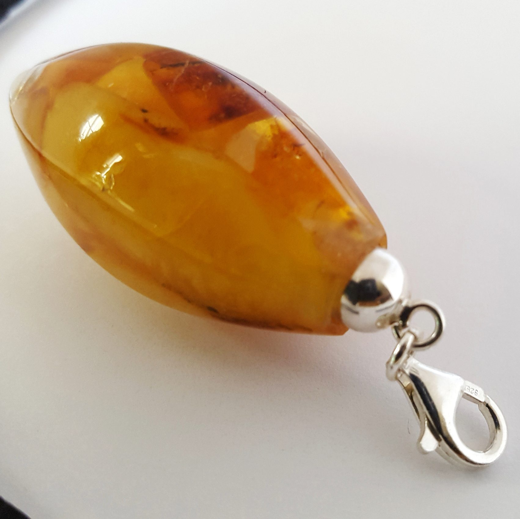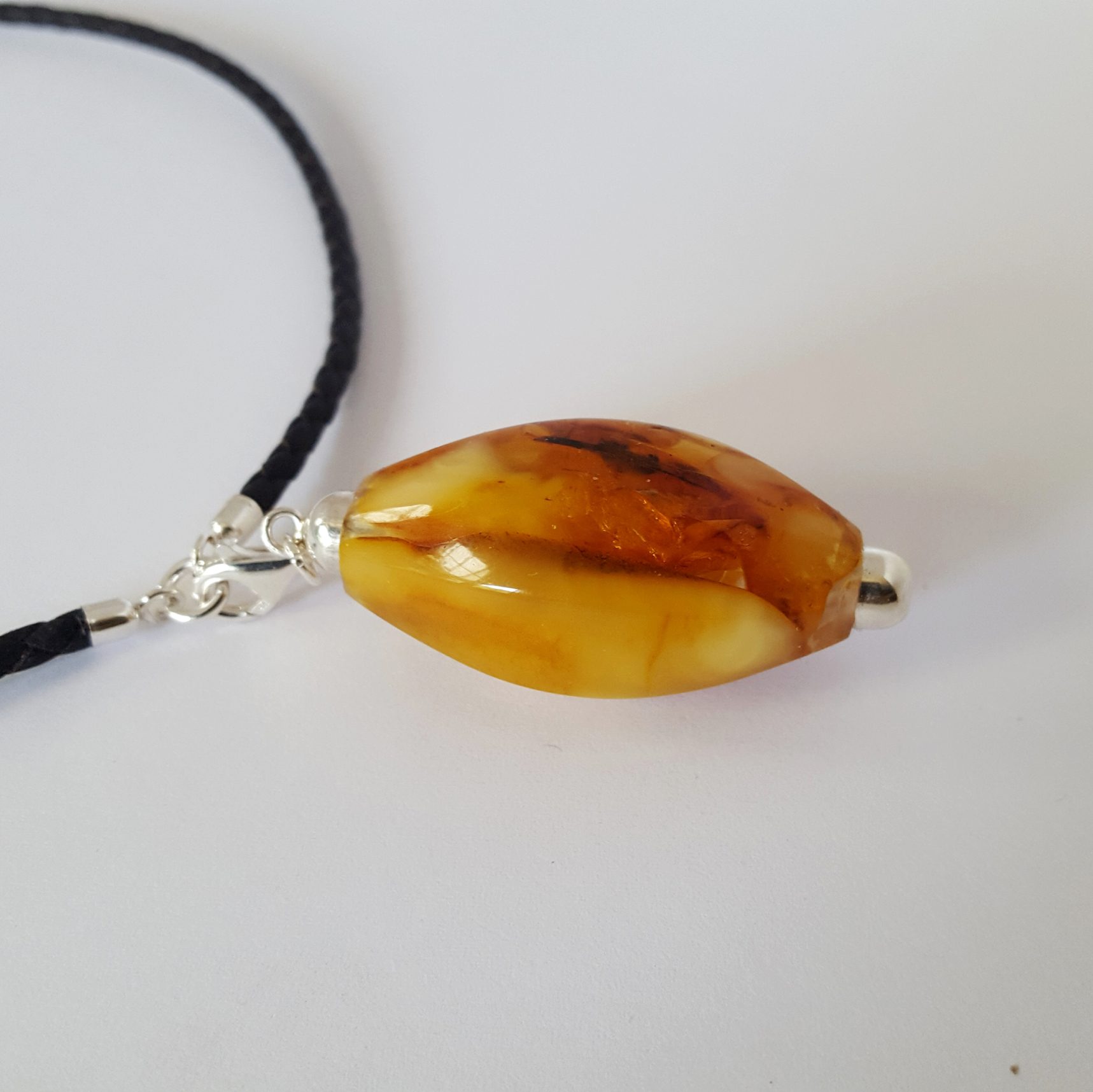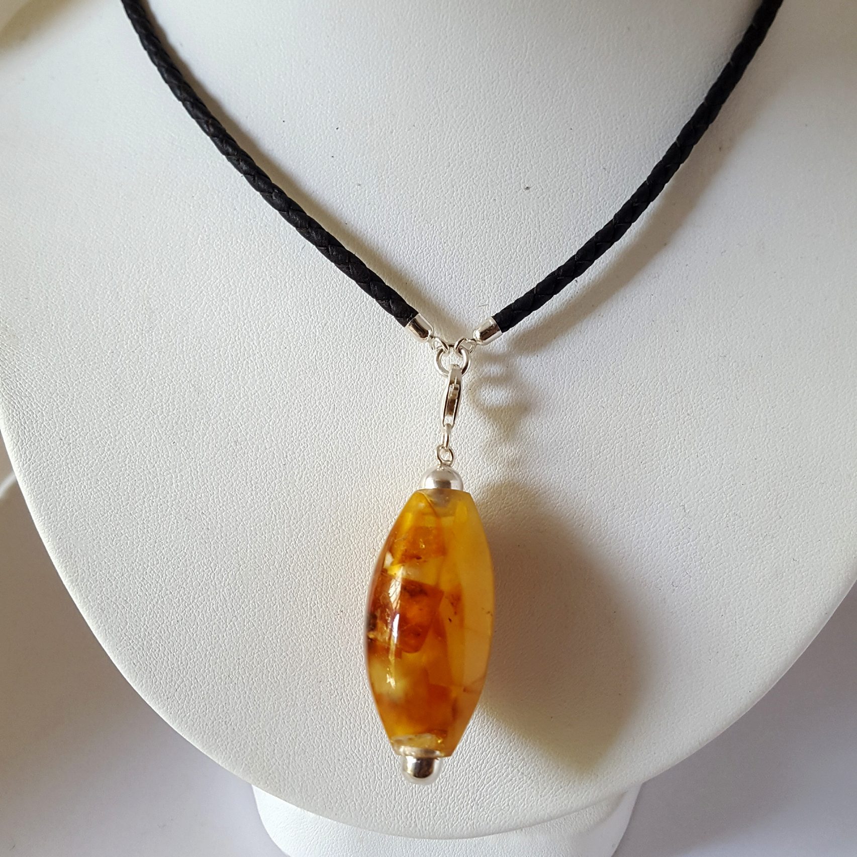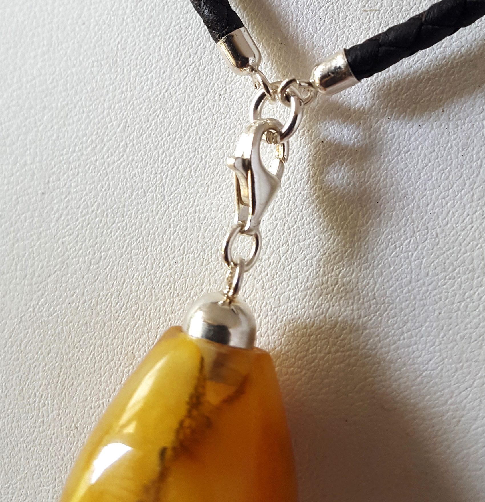 Flacon art déco est un pendentif flacon de style art déco des années 30 . Flacon art déco est sculpté dans un bloc de mosaique d’ambre . Ce block n’est pas conçu comme une mosaique traditionnelle dont la décoration est en surface . C’est une mosaique dans la masse . L’ambre ainsi garde toute sa profondeur et son éclat . Les finitions sont en argent . Le système de fermeture est un mousqueton . Il s’accroche au lien de cuir et d’argent . Ce système permet d’accrocher le flacon à la chaine ou le cordon de votre choix . Il est donc vendu indépendement de son cordon de cuir tressé . Par ailleurs , c’est un cordon de cuir d’excellente qualité ( cuir espagnol de fabrication artisanale ) . Les finitions ( embouts , anneau et mousqueton ) sont en argent .
